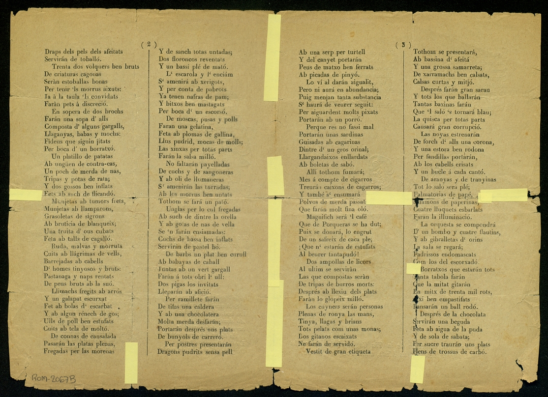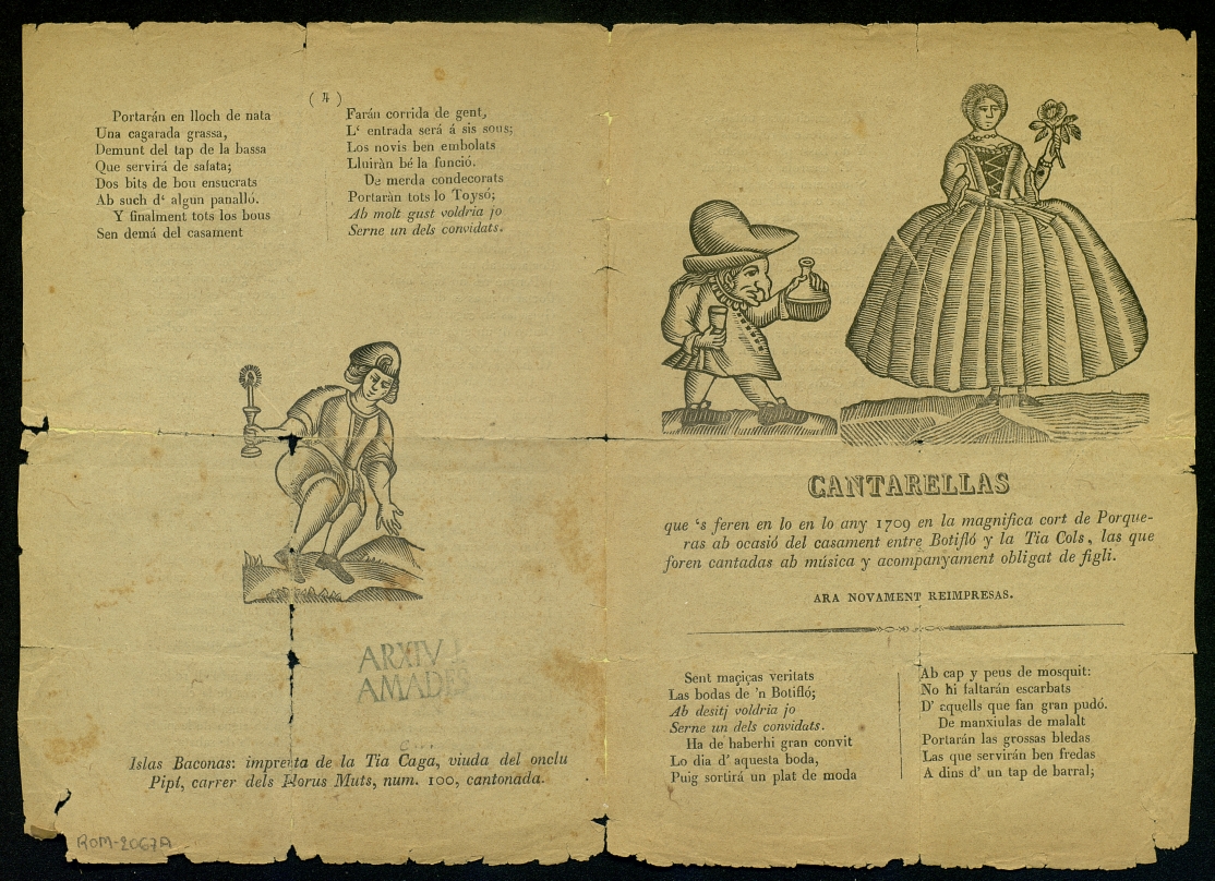 (1709) "Cantarellas : que's feren en lo en lo any 1709 en la magnifica cort de Porqueras ab ocasió del casament entre Botifló y la Tia Cols …". Centre de Documentació de Cultura Popular. <http://hdl.handle.net/10687/120666>. [Consulta: ]