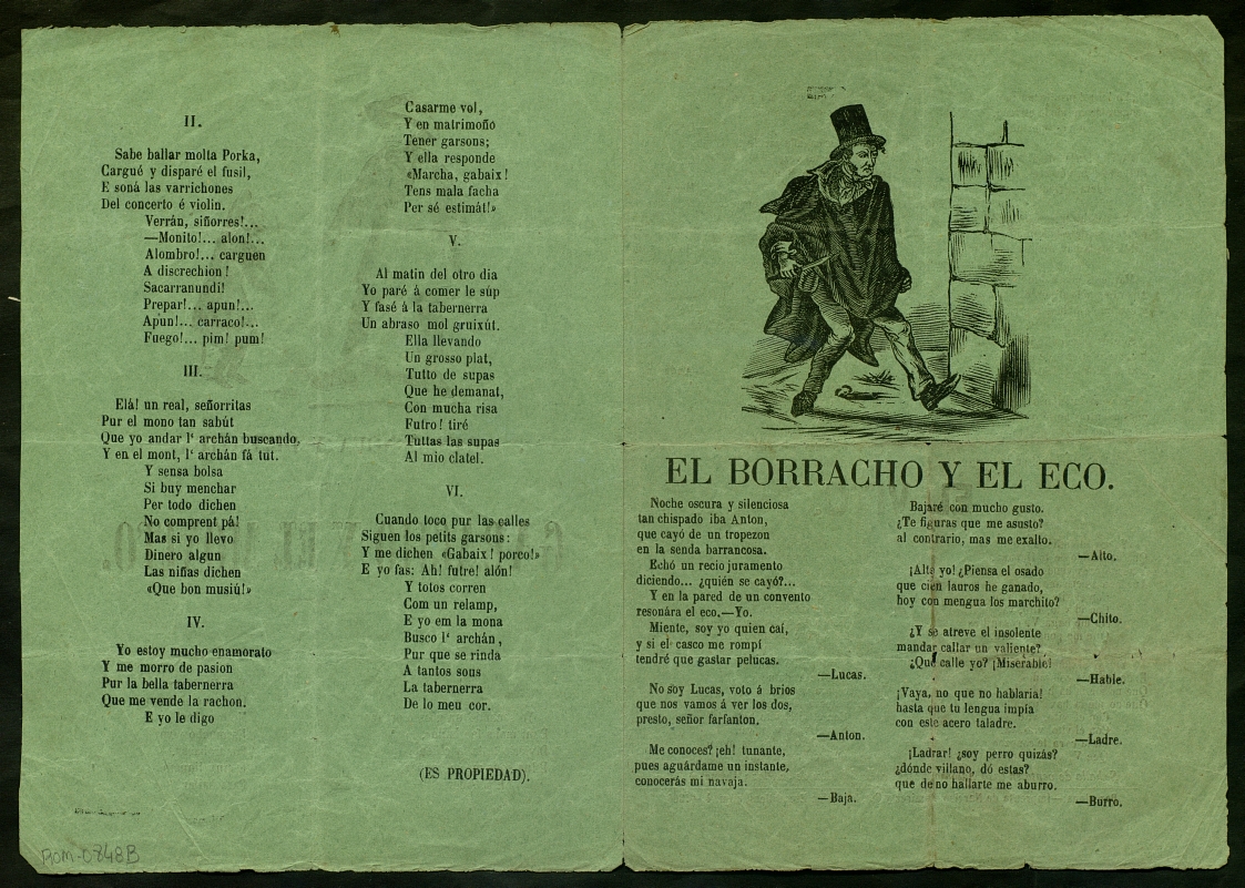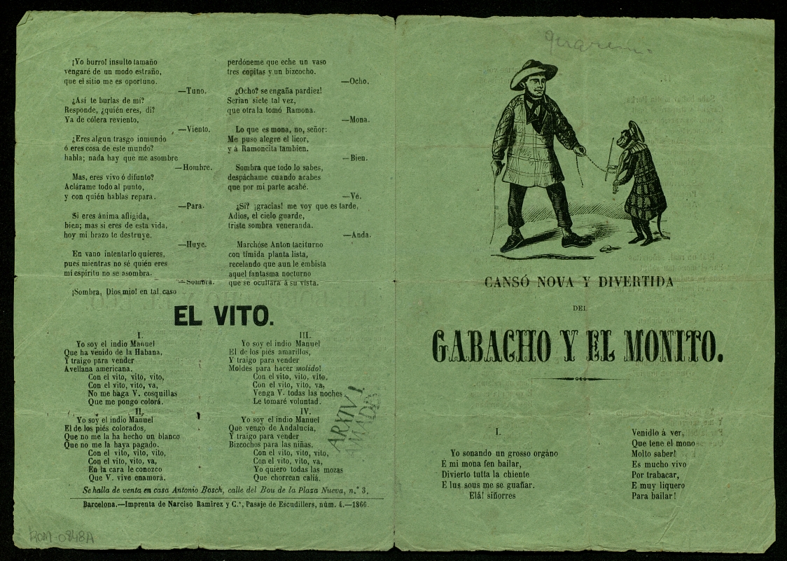 (1866) "Cansó Nova y Divertida del Gabacho y el monito ; El Borracho y el eco ; El Vito". Centre de Documentació de Cultura Popular. <http://hdl.handle.net/10687/120715>. [Consulta: ]