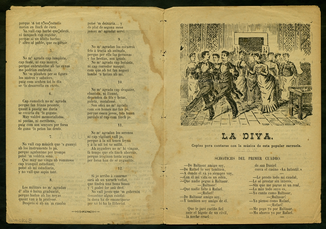 ([18-) "La Coqueta : Relassió Nova y divertida ; La Diva : Coplas para cantarse con lamúsica de esta popular zarzuela ; Cancion de los alemanes ; Wals". Centre de Documentació de Cultura Popular. <http://hdl.handle.net/10687/120759>. [Consulta: ]