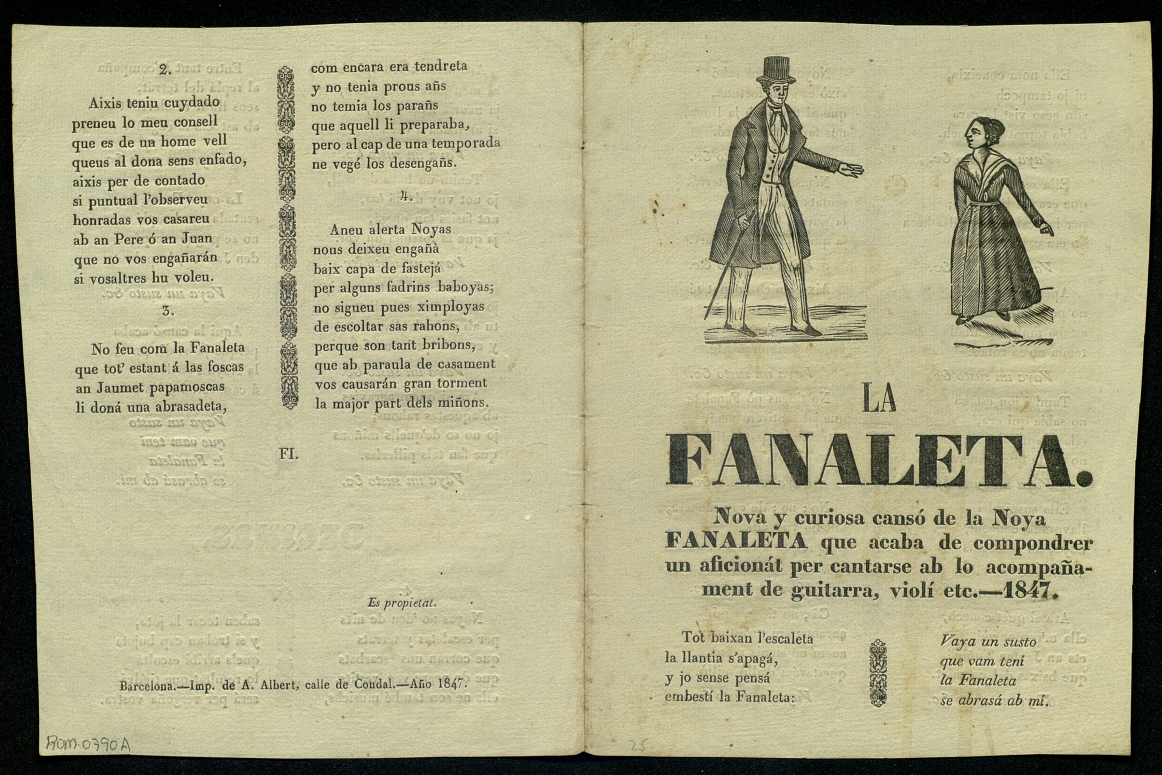 (1847) "La Fanaleta : Nova y curiosa cansó de la Noya Fanaleta que acaba de compondrer un aficionát per cantarse ab lo acompañament de guitarra, violí etc.-1847 ; Decimas". Centre de Documentació de Cultura Popular. <http://hdl.handle.net/10687/120773>. [Consulta: ]
