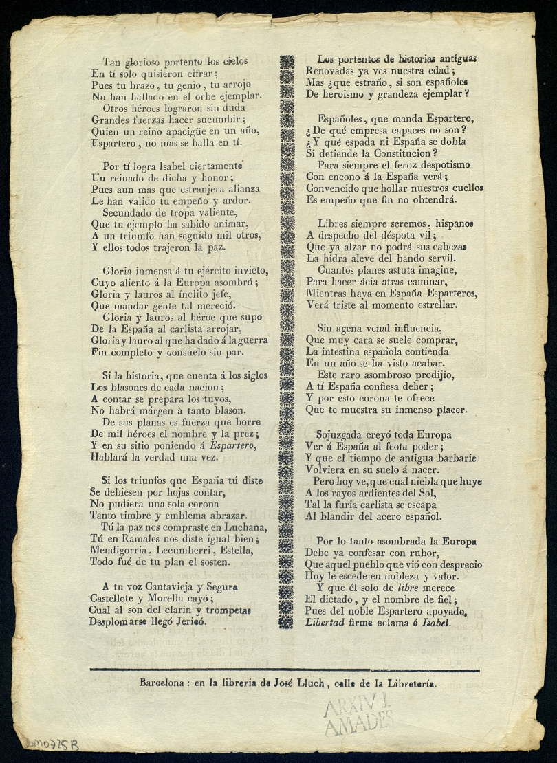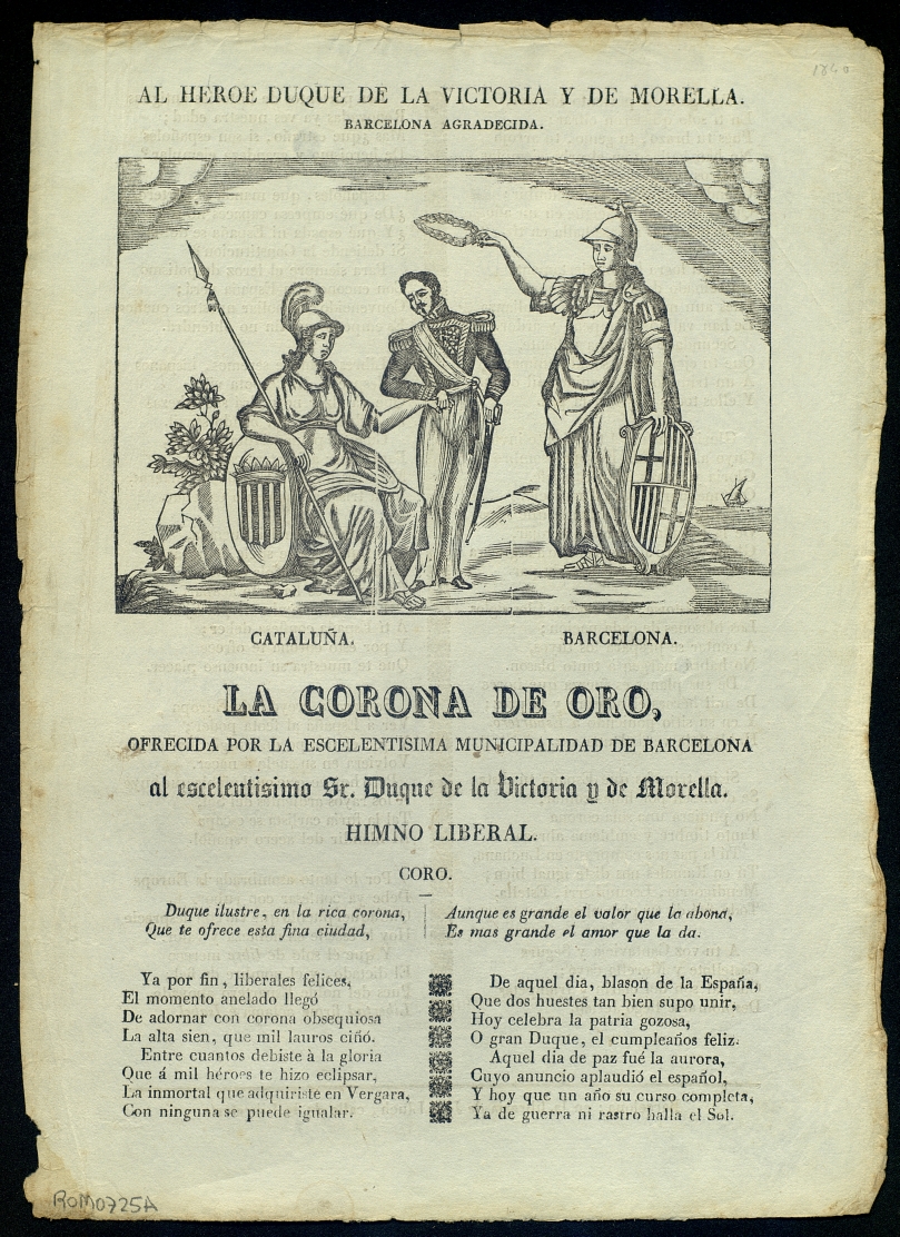 ([184) "La corona de oro : Ofrecida por la Escelentisima Municipalidad de Barcelona al escelentisimo Sr. Duque de la Victoria y de Morella : Himno Liberal.". Centre de Documentació de Cultura Popular. <http://hdl.handle.net/10687/120842>. [Consulta: ]