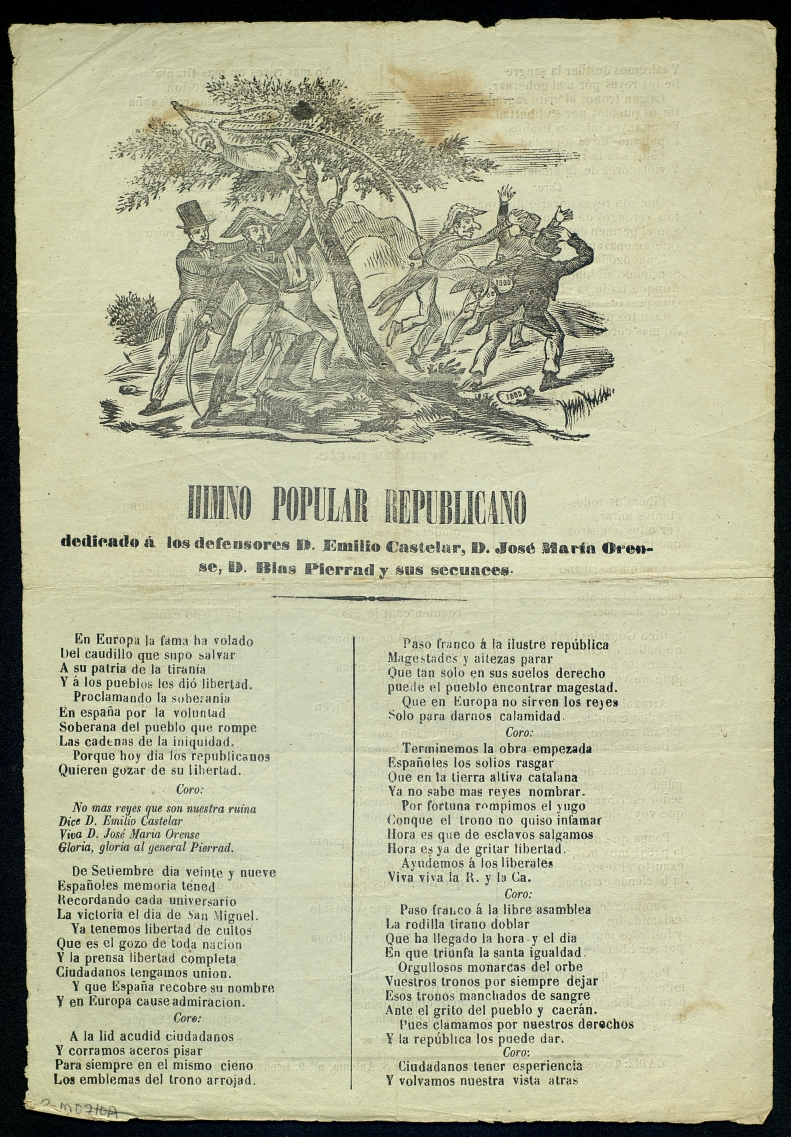 J.M.V.. (1869) "Himno popular republicano : dedicado á los defensores D. Emilio Castelar, D.José Maria Orense, D. Blas Pierrad y sus secuaces ; Agonia y testamento de los moderados : segunda parte.". Centre de Documentació de Cultura Popular. <http://hdl.handle.net/10687/120859>. [Consulta: ]
