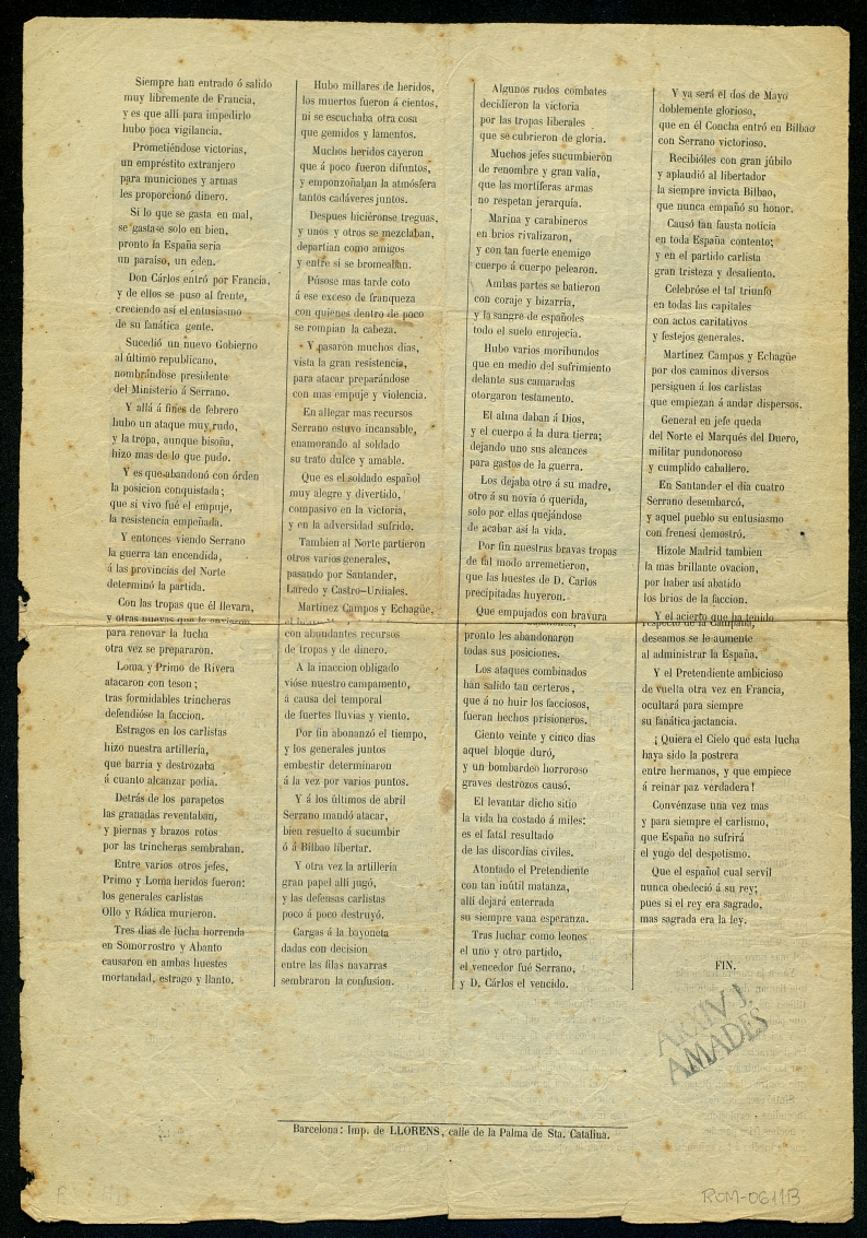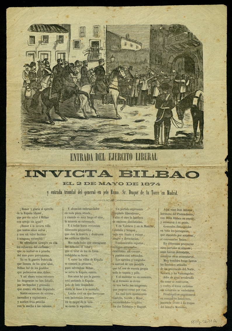 ([ca.) "Entrada del ejercito liberal : invicta Bilbao : El 2 de Mayo de 1874 : y entrada triunfal del general en jefe Exmo. Sr. Duque de la Torre en Madrid.". Centre de Documentació de Cultura Popular. <http://hdl.handle.net/10687/120959>. [Consulta: ]