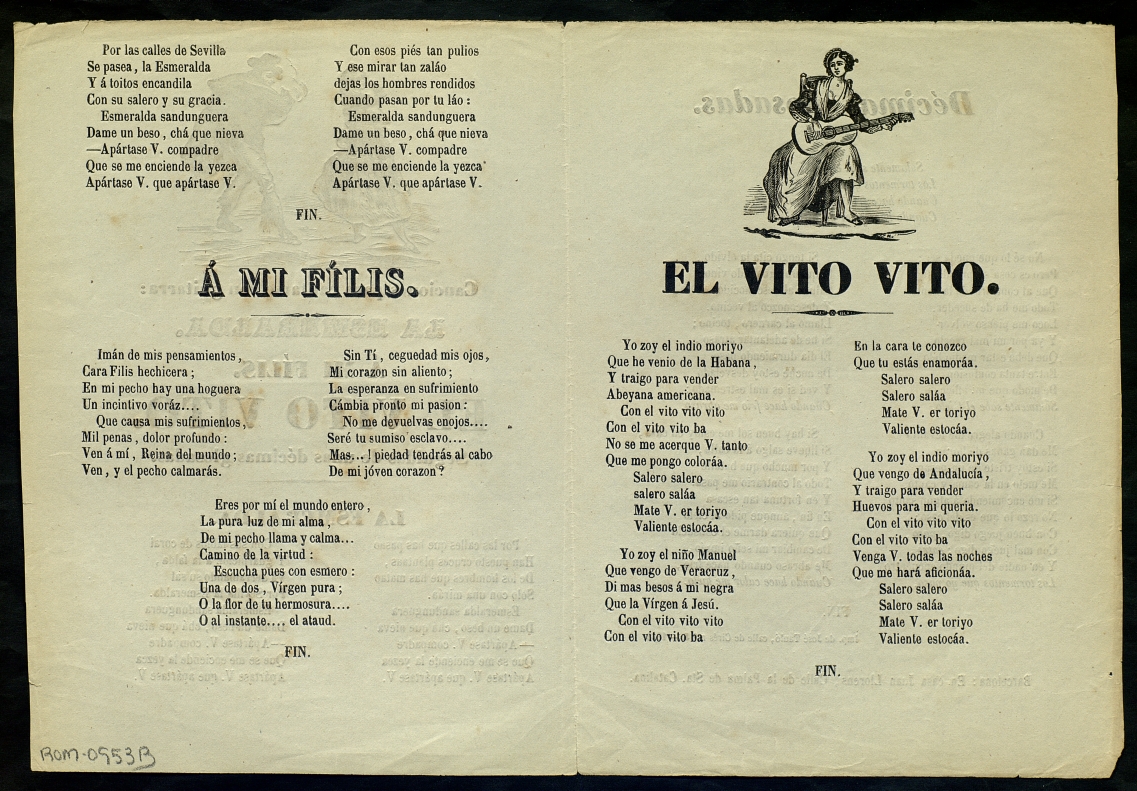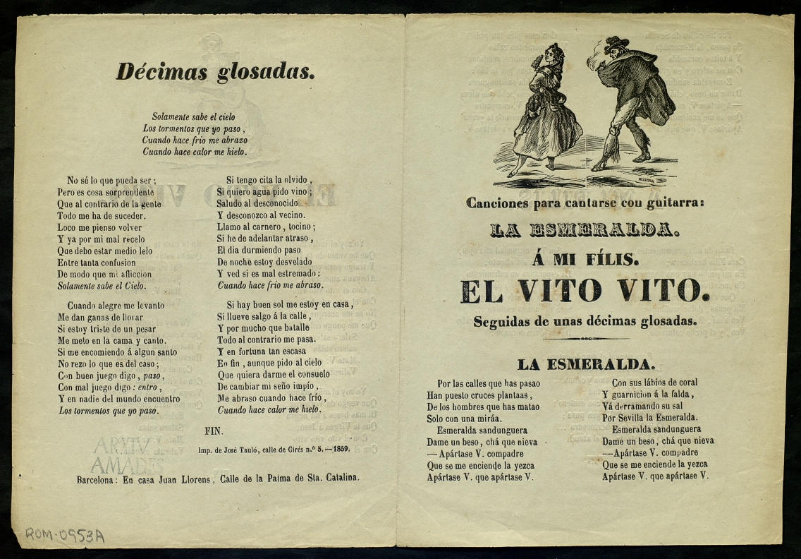 (1859) "La esmeralda ; A mi Fílis ; El vito vito ; Décimas glosadas". Centre de Documentació de Cultura Popular. <http://hdl.handle.net/10687/120987>. [Consulta: ]
