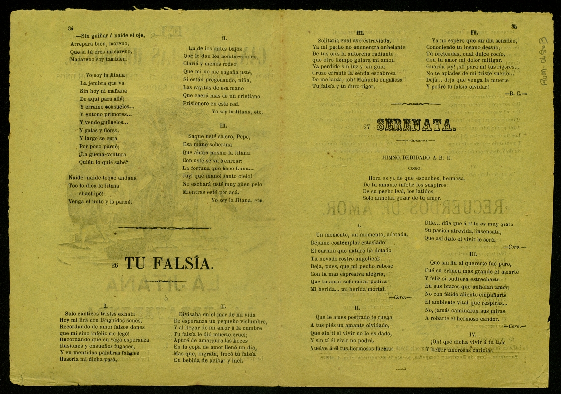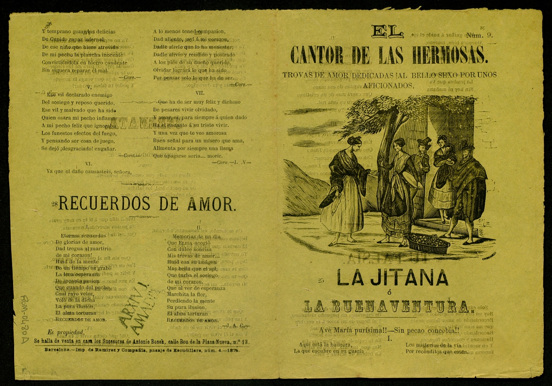 B.C.; J.V.; Clavé, Josep Anselm. (1875) "El Cantor de las hermosas : Trovas de amor dedicadas al bello sexo por unos aficionados : La Jitana : ó la buenaventura ; Tu falsía ; Serenata : himno dedicado a B.R. ; Recuerdos de amor". Centre de Documentació de Cultura Popular. <http://hdl.handle.net/10687/121039>. [Consulta: ]
