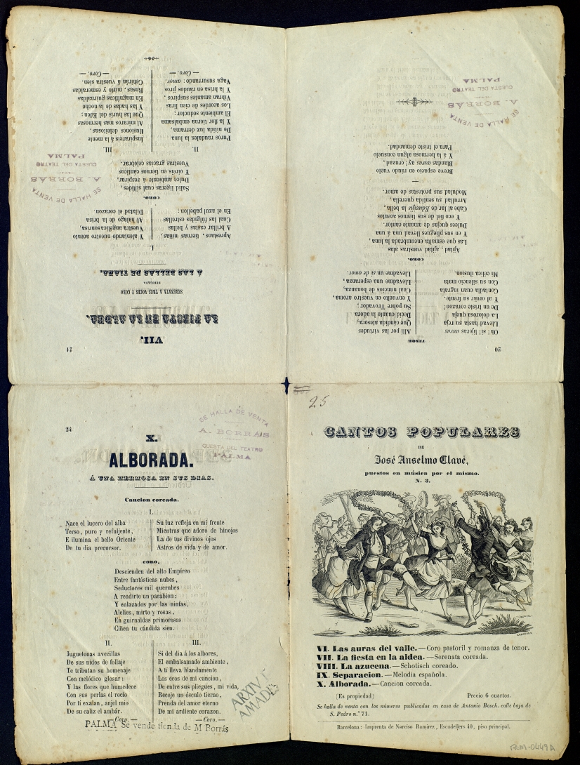 Clavé, Josep Anselm. ([ca.) "Cantos populares ; Las auras del valle ; La fiesta en la aldea : a las bellas de tiana ; La azucena ; Separacion ; Alborada : á una hermosa en sus dias". Centre de Documentació de Cultura Popular. <http://hdl.handle.net/10687/121073>. [Consulta: ]