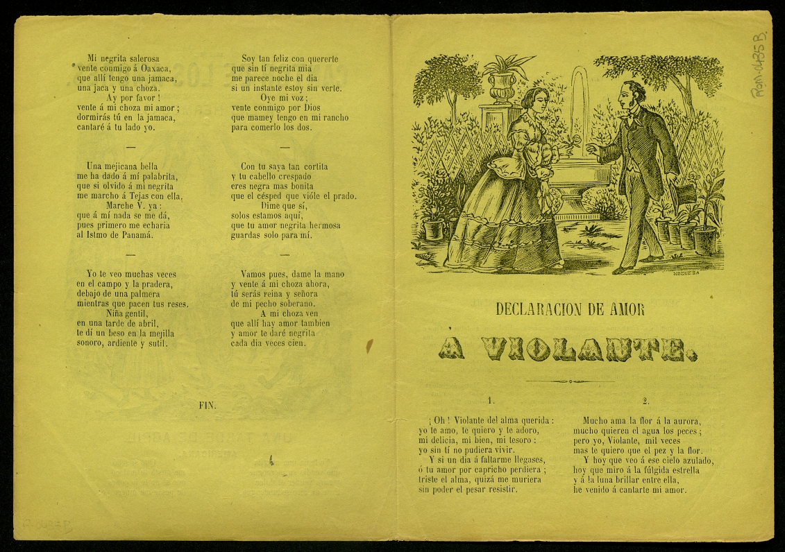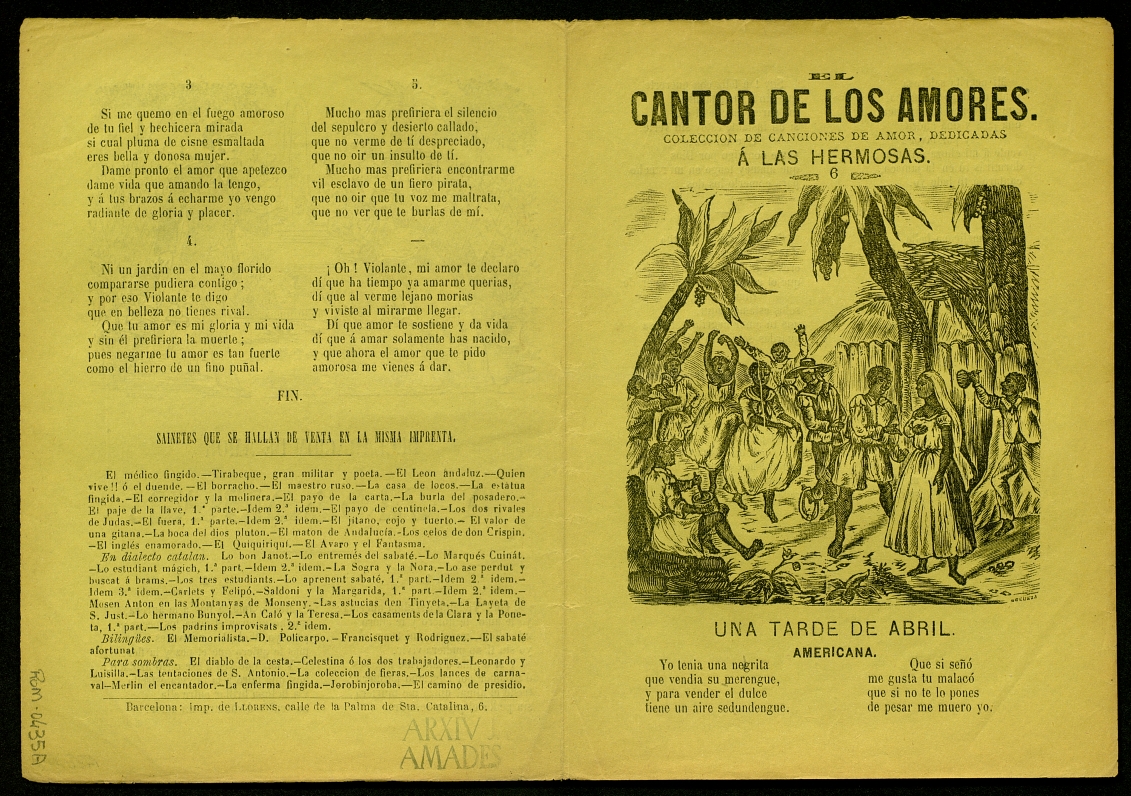 ([ca.) "El Cantor de los amores : Colección de canciones de amor, dedicadas á las hermosas ; Una tarde de abril : americana ; Declaracion de amor : a Violante". Centre de Documentació de Cultura Popular. <http://hdl.handle.net/10687/121089>. [Consulta: ]