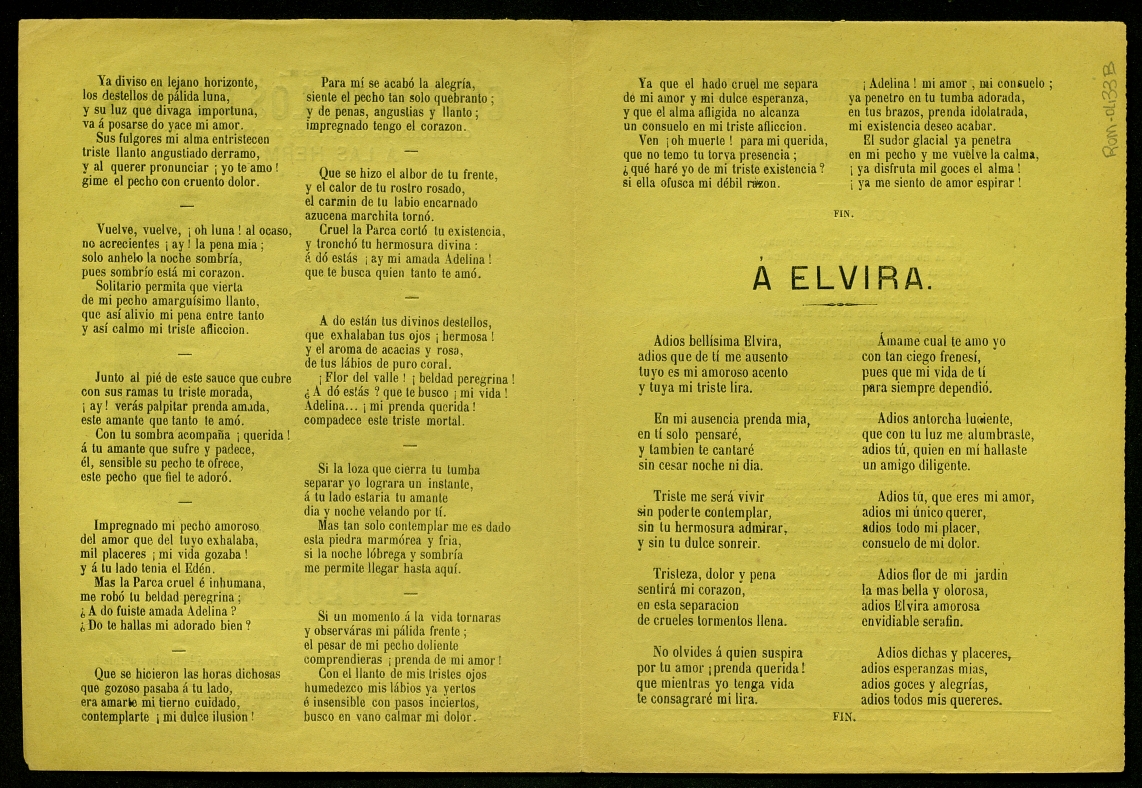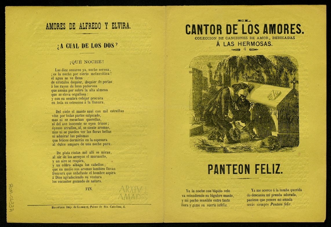 ([ca.) "El Cantor de los amores : Colección de canciones de amor, dedicadas á las hermosas ; Panteon feliz ; Á Elvira ; Amores de Alfredo y Elvira : A cual de los dos?". Centre de Documentació de Cultura Popular. <http://hdl.handle.net/10687/121091>. [Consulta: ]