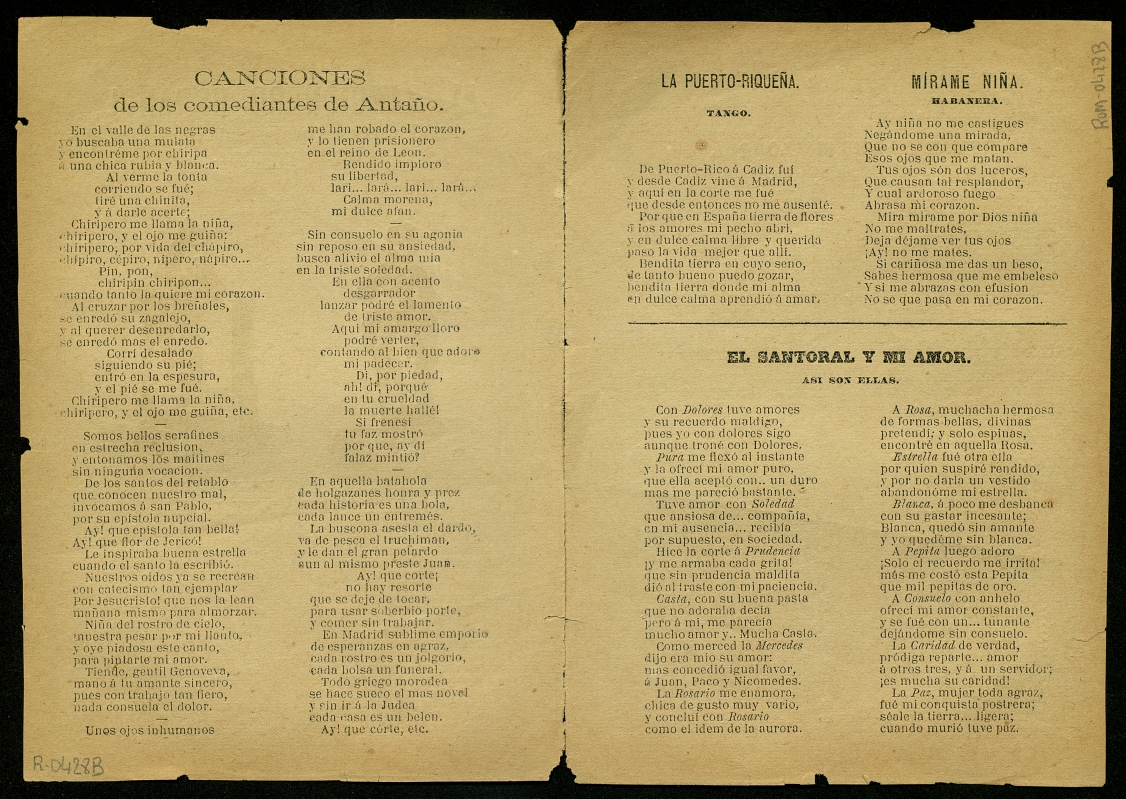 ([18-) "El Cancionero español ; Colección de canciones que se cantan en los teatros y cantos populares ; La gitanilla ; Canciones de los comediantes de Antaño ; La puerto-riqueña: tango ; Mírame niña : havanera ; El santoral y mi amor : así son ellas". Centre de Documentació de Cultura Popular. <http://hdl.handle.net/10687/121096>. [Consulta: ]