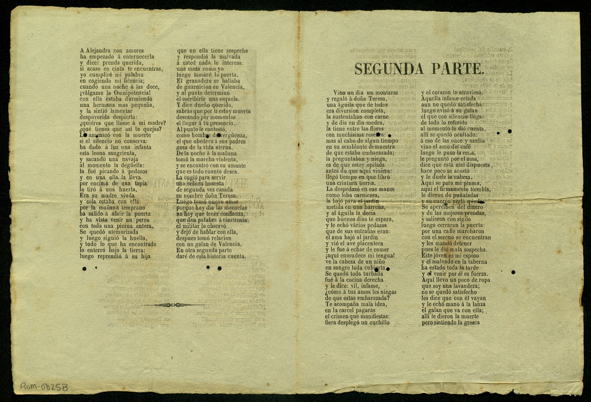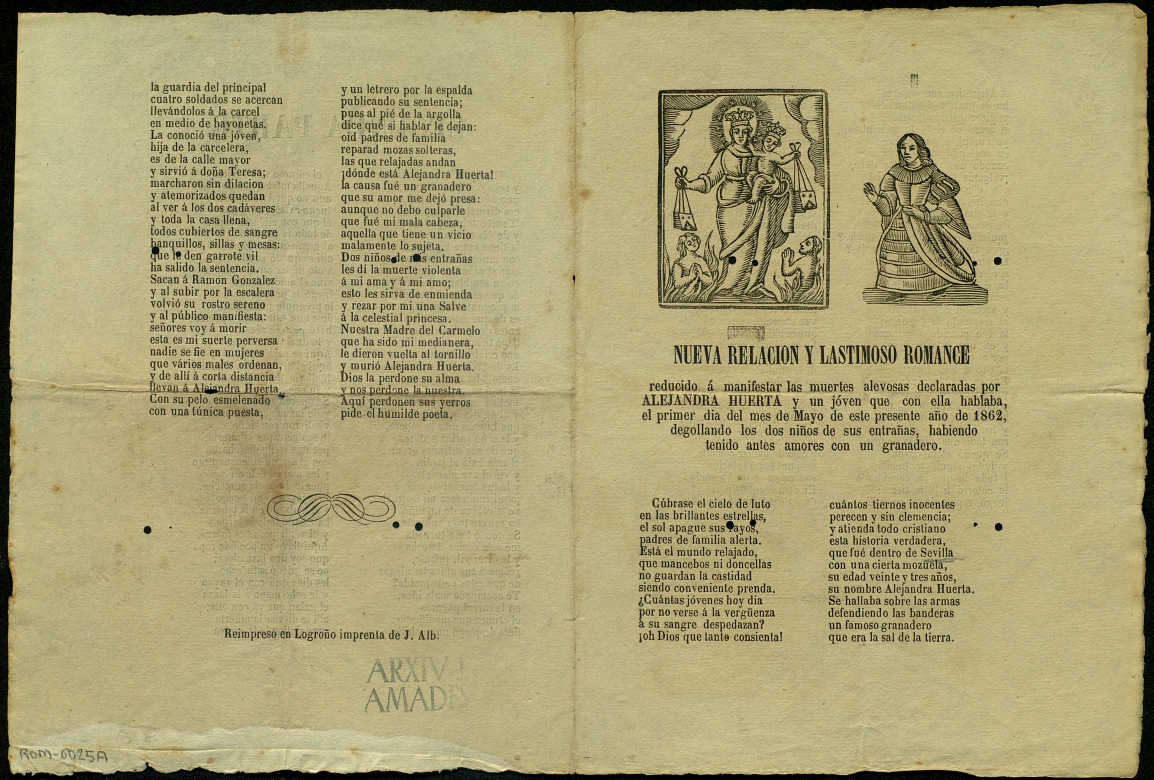 (1862) "Nueva relacion y lastimoso romance : reducido á manifestar las muertes alevosas declaradas por Alejandra Huerta y un jóven que con ella hablaba, el primer dia del mes de Mayo de este presente año de 1862, degollando los dos niños de sus entrañas, habiendo tenido antes amores con un ganadero". Centre de Documentació de Cultura Popular. <http://hdl.handle.net/10687/121152>. [Consulta: ]