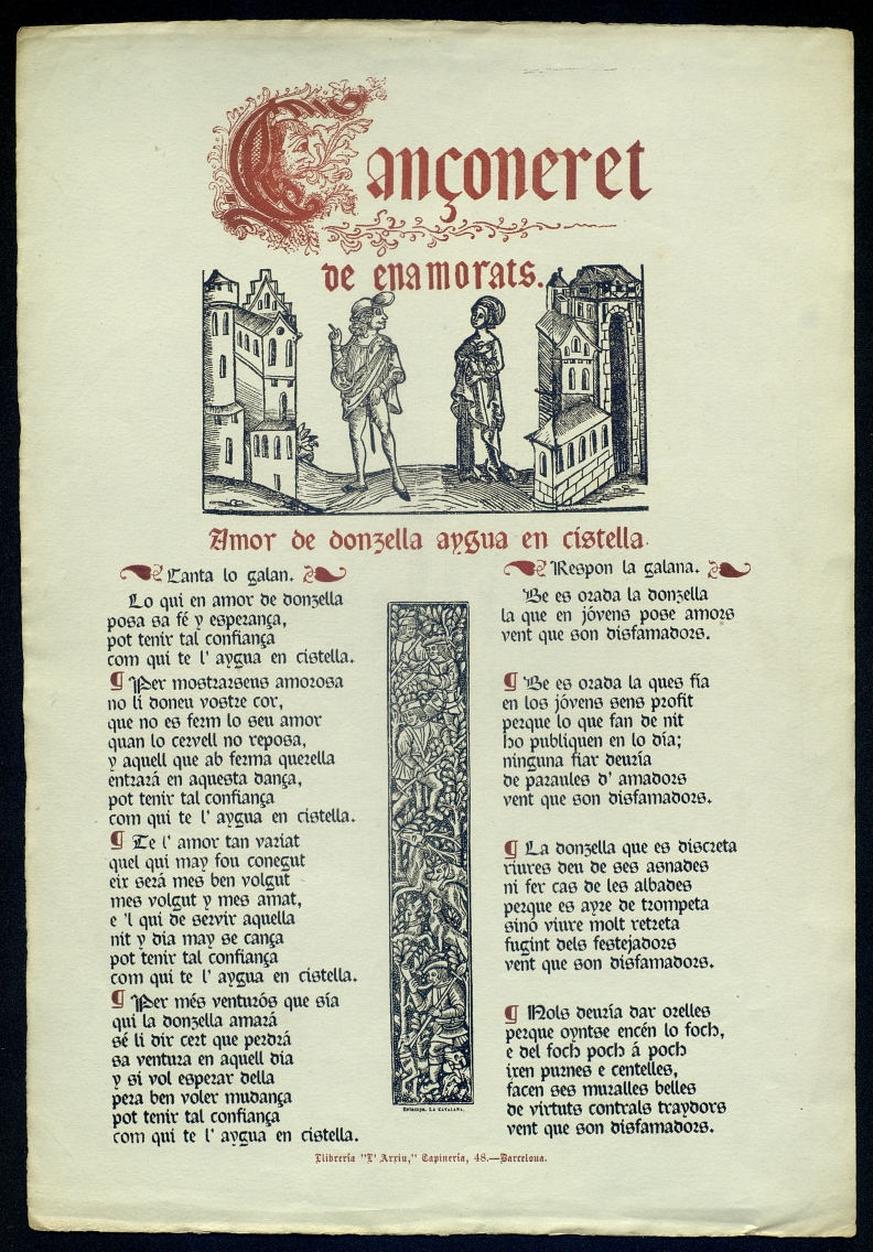 ([ca.) "Cançoneret de enamorats ; Amor de donzella aygua en cistella". Centre de Documentació de Cultura Popular. <http://hdl.handle.net/10687/121188>. [Consulta: ]