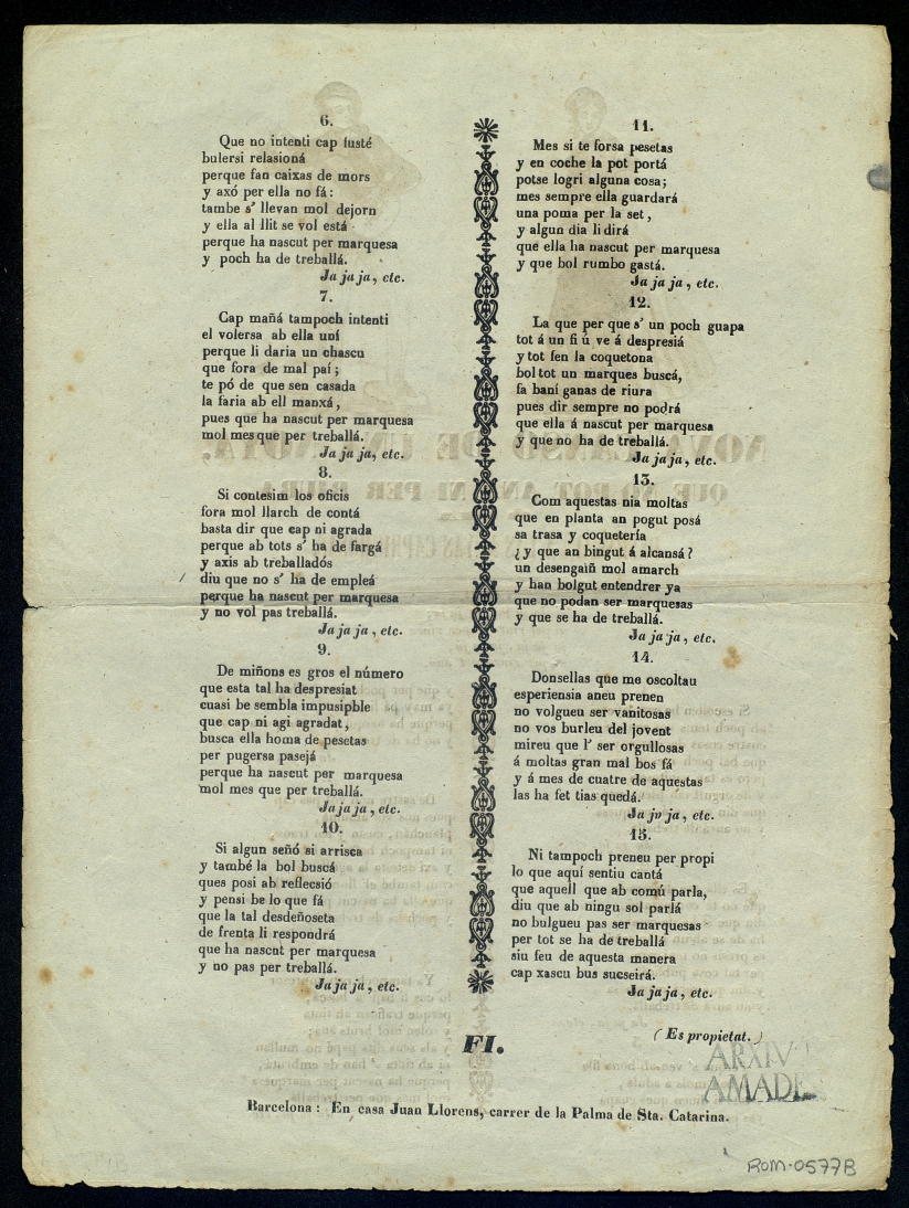([18-) "Nova cansó de una noya, que no pot aná ni per riura : ó sia desengaiñ á las noyas carprichosas". Centre de Documentació de Cultura Popular. <http://hdl.handle.net/10687/121196>. [Consulta: ]