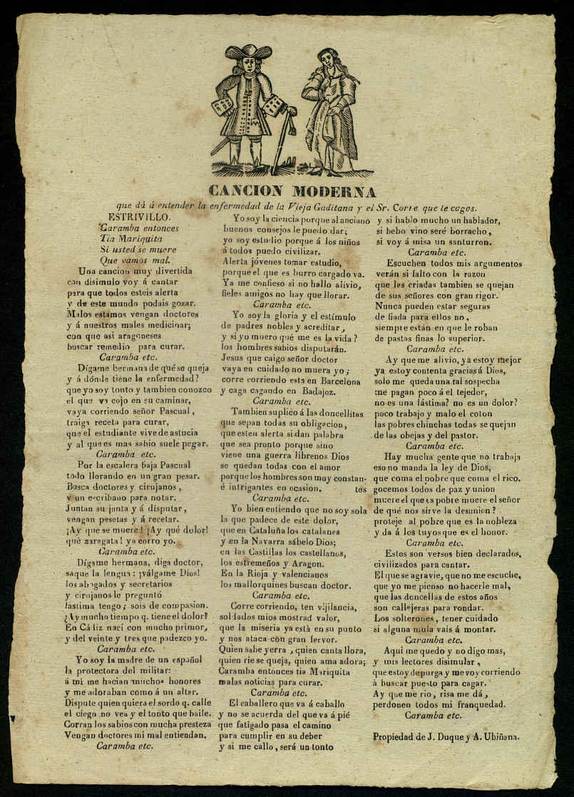 ([18-) "Cancion moderna : que dá á entender la enfermedad de la Vieja Gaditana y el Sr. Corre que te cagas". Centre de Documentació de Cultura Popular. <http://hdl.handle.net/10687/121199>. [Consulta: ]