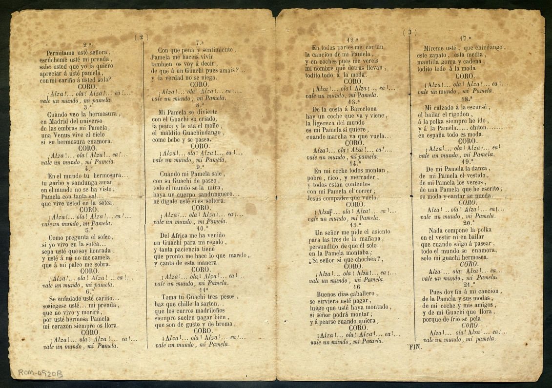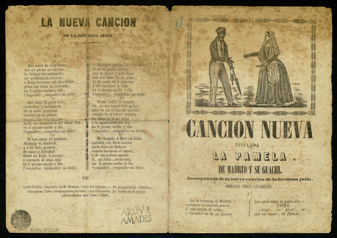 (1846) "Cancion Nueva titulada La Pamela de Madrid y su guachi ; La nueva cancion de la hermosa Julia". Centre de Documentació de Cultura Popular. <http://hdl.handle.net/10687/121257>. [Consulta: ]