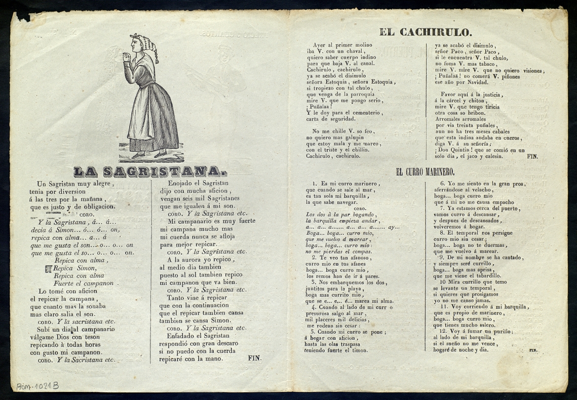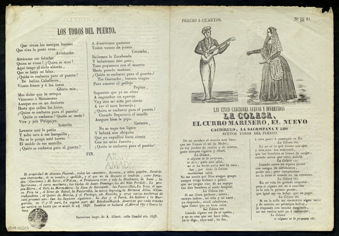 Cinc cançons humorístiques i amoroses. "La colasa" també es troba en el ROM-893 i al ROM-1246, "Los toros del puerto" al ROM-0896. "La Colasa", "El Curro marinero", "El Cachirulo" i "La Sacristana" així com també un parel de xilografies també apareixen al ROM-0950.