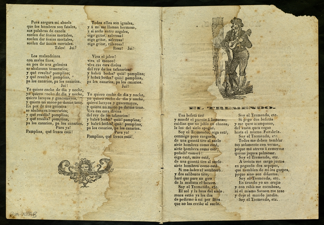 Gravat xilogràfic amb forma de figura a la capçalera del romanço i a la tercera pàgina, ornamentació xilogràfica al final de la segona pàgina. Text a dues columnes. Estat de conservació regular, taques de fòxing i gran taca d'humitat que va del centre cap als marges. Paper de fil.