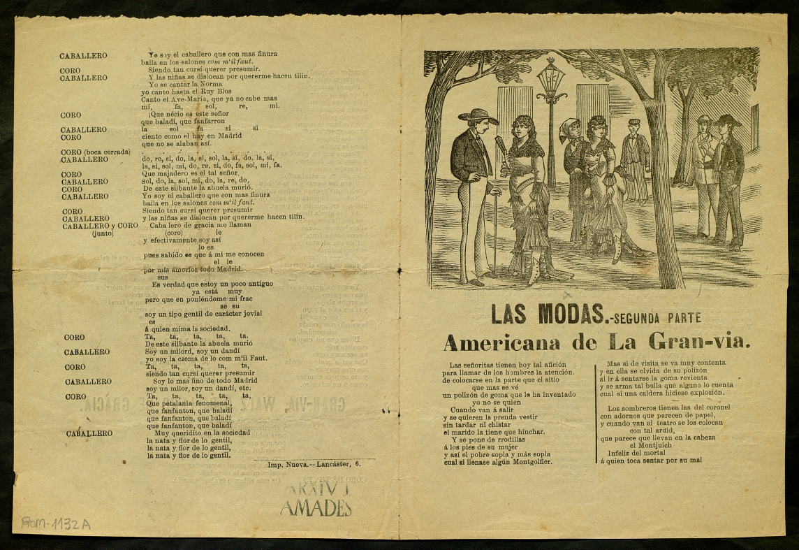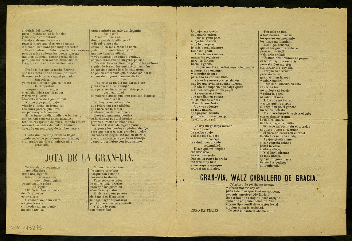Pérez González, Felipe. ([188) "Las modas : Segunda parte : Americana de La Gran-via ; Jota de la Gran-via ; Gran-via : walz caballero de gracia". Centre de Documentació de Cultura Popular. <http://hdl.handle.net/10687/228778>. [Consulta: ]