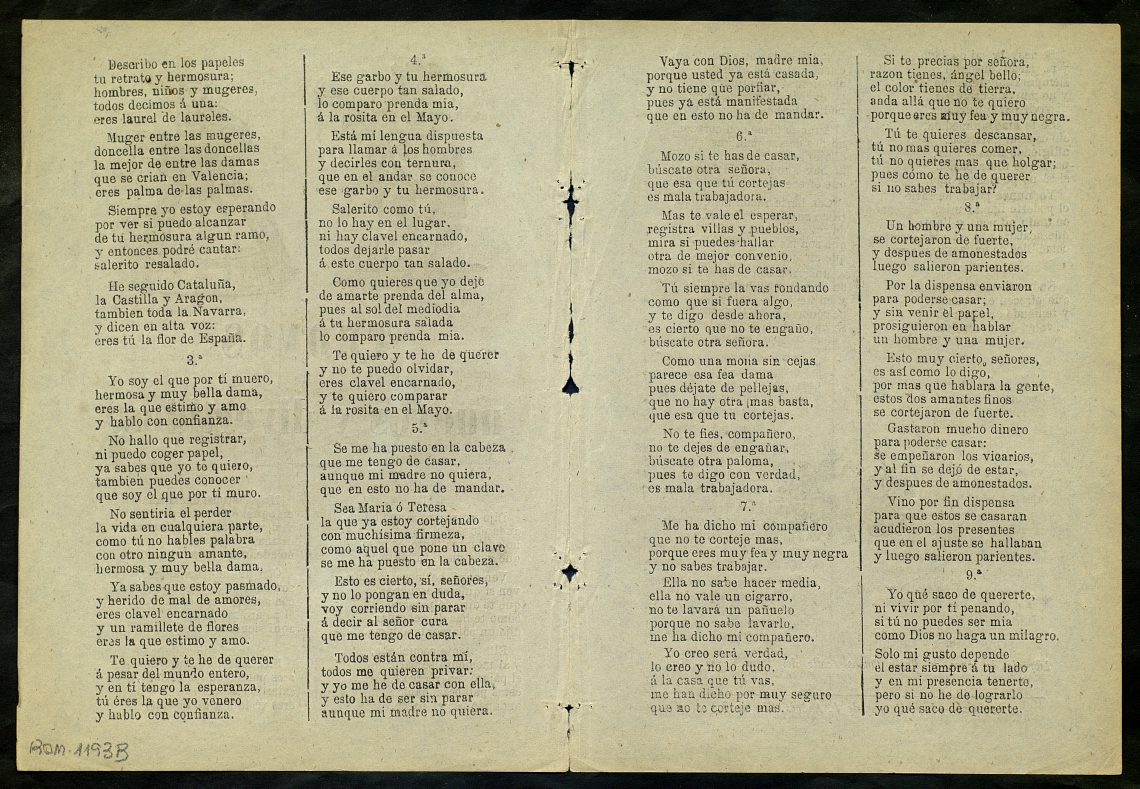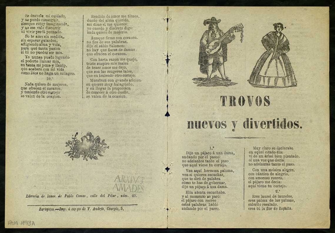 Dos gravats xilogràfics amb forma de figura a la capçalera del romanço i petita ornamentació xilogràfica al final del text. Text a dues columnes, separades per corondell. Estat de conservació bo, restes de cola al llom. Paper mecànic.