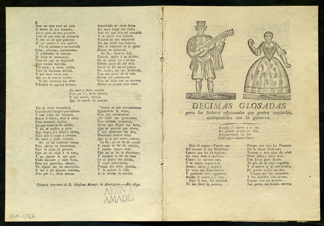 (1836) "Decimas glosadas : para los señores aficionados que gusten cantarlas acompañadas con la guitarra". Centre de Documentació de Cultura Popular. <http://hdl.handle.net/10687/228861>. [Consulta: ]