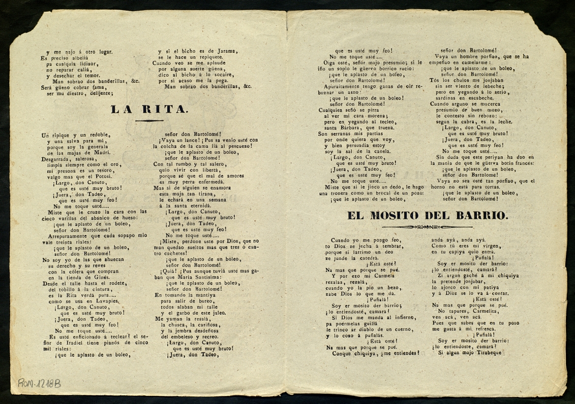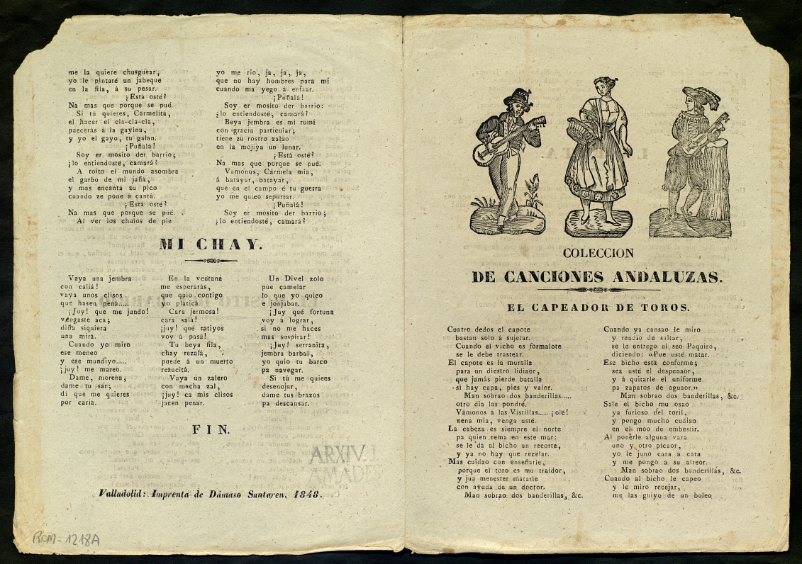 (1848) "Colección de canciones andaluzas : el capeador de toros ; La Rita ; El mosito del barrio ; Mi chay". Centre de Documentació de Cultura Popular. <http://hdl.handle.net/10687/228863>. [Consulta: ]