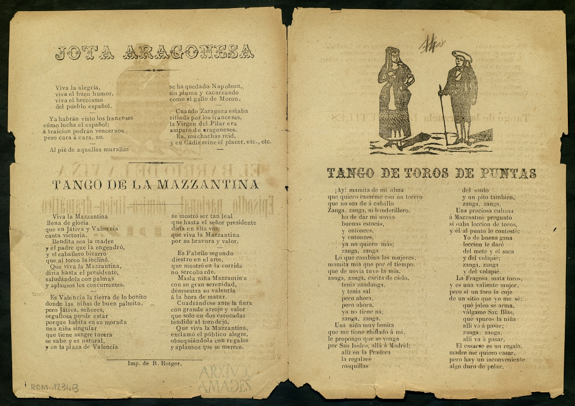 Pérez González, Felipe. ([188) "El barrio de la viña : del episodio nacional, cómico-lírico-dramático, Cádiz : pasa calle ; Jota aragonesa ; Tango de la Mazzantina ; Tango de toros de puntas ; Tango de la zarzuela Los inútiles". Centre de Documentació de Cultura Popular. <http://hdl.handle.net/10687/228878>. [Consulta: ]