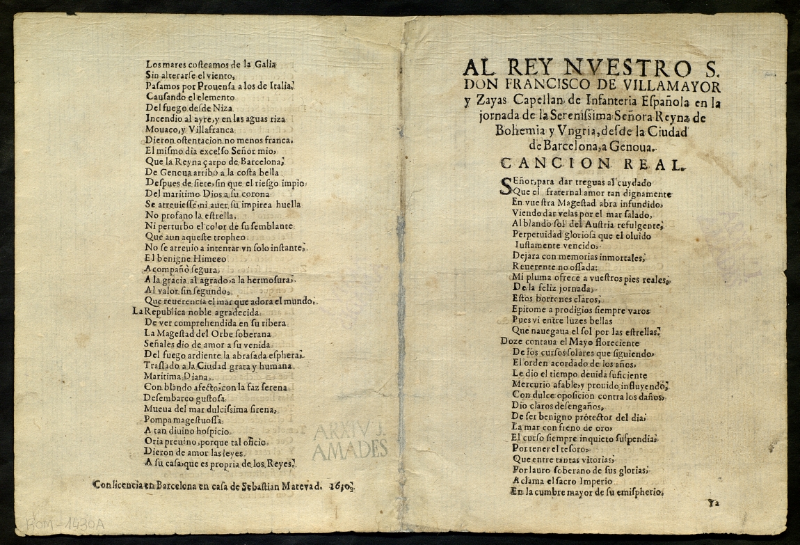 Carrillo, Alonso. (1630) "Al rey nvestro S. don Francisco de Villamayor y Zayas Capellan de Infanteria Española en la jornada de la Serenissima Señora Reyna de Bohemia y Vngria, desde la Ciudad de Barcelona a Genoua : Cancion real". Centre de Documentació de Cultura Popular. <http://hdl.handle.net/10687/229070>. [Consulta: ]