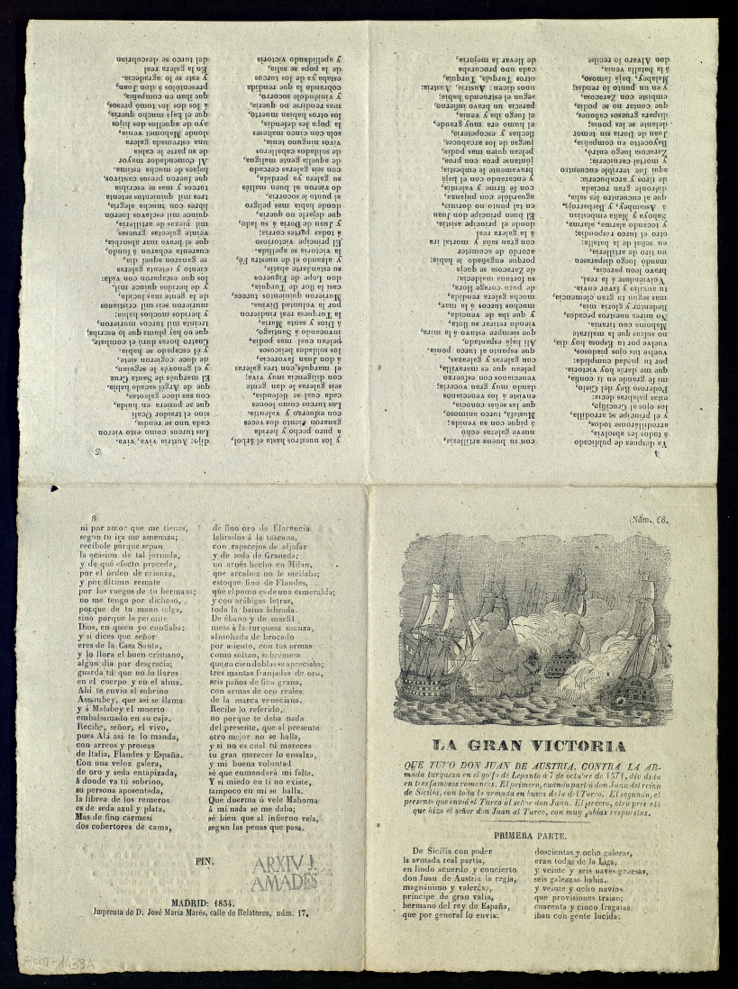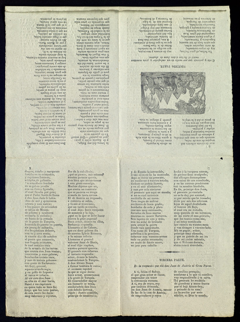 "Dividida en tres famosos romances. El primero, quando partiò Don Juan del Reyno de Sicilia, con toda la Armada en busca de la del Turco. El segundo, el presente que embiò el Turco al Señor Don Juan. El tercero, otro presente que hizo el Señor Don Juan al Turco; con muy sabias respuestas". Sobre la batalla de Lepant de 1571. Altres edicions al ROM-1436, al ROM-1437, al ROM-1438, al ROM-1440 i al ROM-1441.