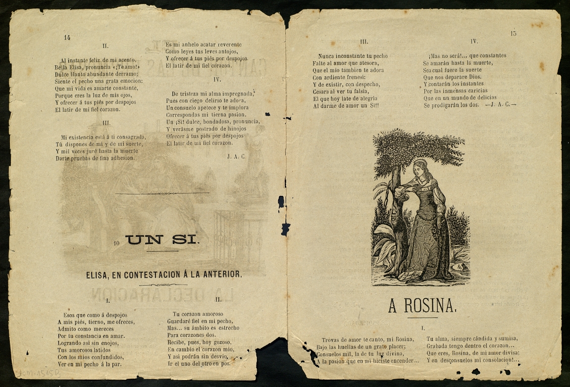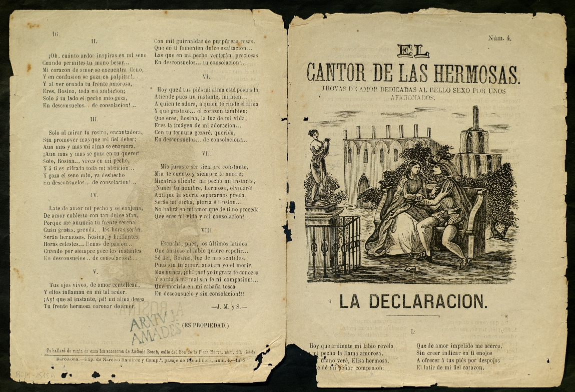 Clavé, Josep Anselm. (1878) "El Cantor de las hermosas : Trobas de amor dedicadas al bello secso por unos aficionados ; La declaracion ; Un si : Elisa, en contestacion á la anterior ; A Rosina". Centre de Documentació de Cultura Popular. <http://hdl.handle.net/10687/229153>. [Consulta: ]