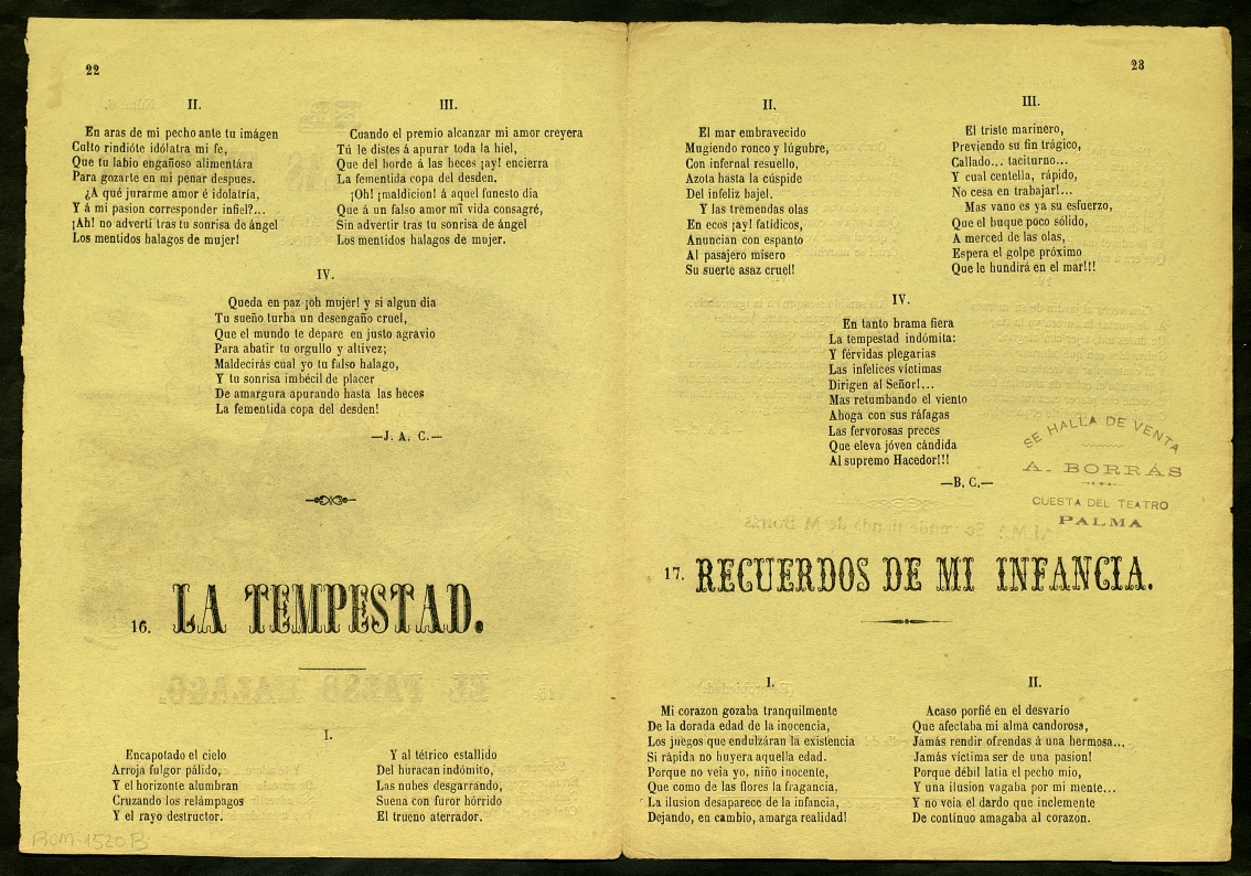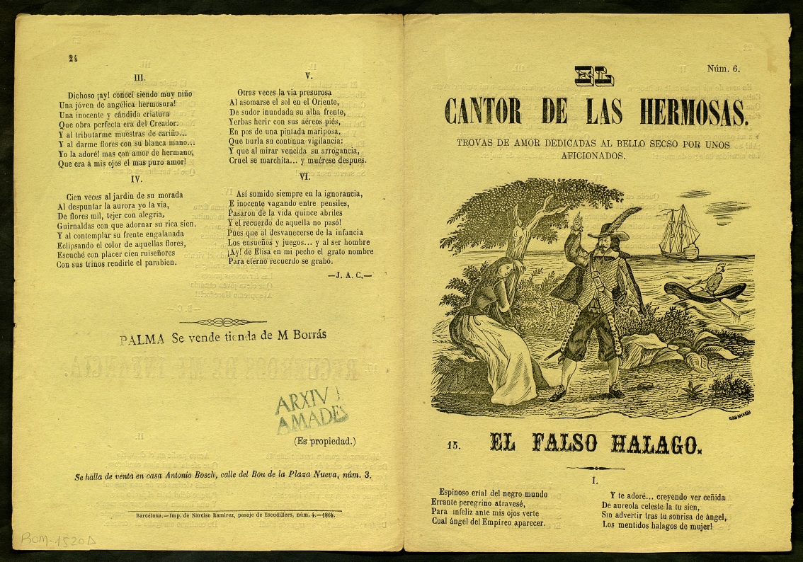 Clavé, Josep Anselm. (1864) "El Cantor de las hermosas : Trovas de amor dedicadas al bello secso por unos aficionados ; El falso halago ; La tempestad ; Recuerdos de mi infancia". Centre de Documentació de Cultura Popular. <http://hdl.handle.net/10687/229158>. [Consulta: ]