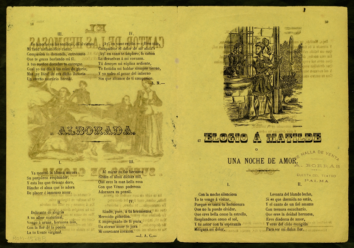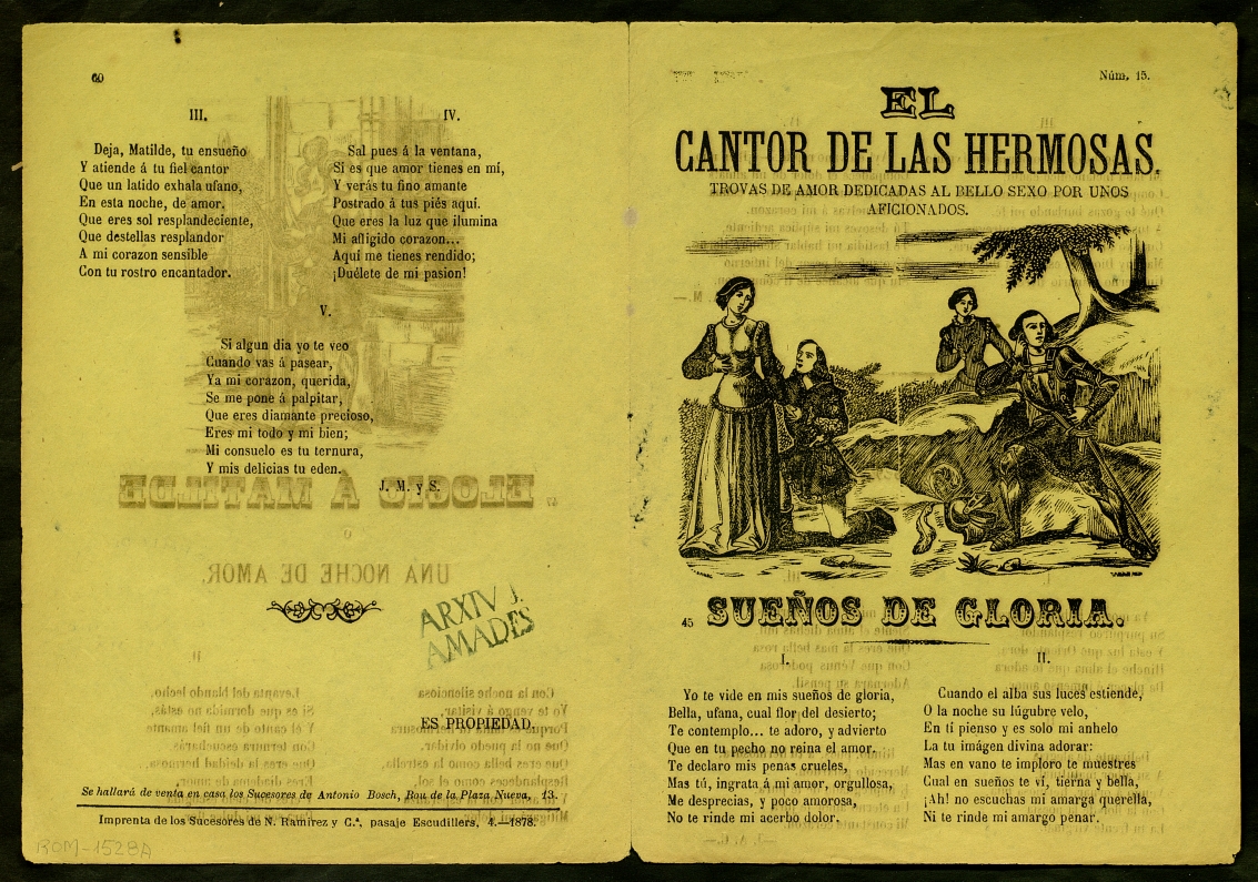 Clavé, Josep Anselm. (1878) "El Cantor de las hermosas : Trovas de amor dedicadas al bello sexo por unos aficionados ; Sueños de gloria ; Alborada ; Elogio á Matilde : o una noche de amor". Centre de Documentació de Cultura Popular. <http://hdl.handle.net/10687/229166>. [Consulta: ]
