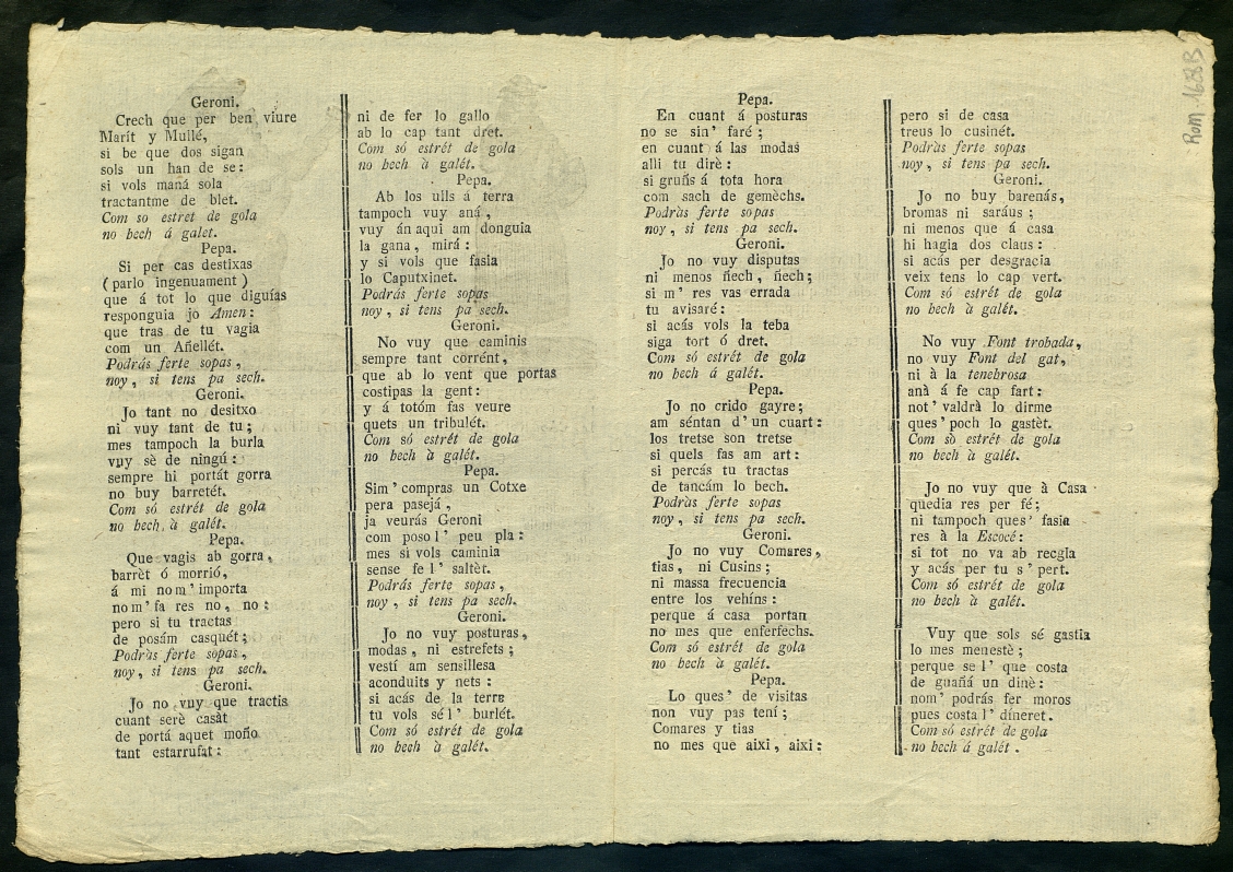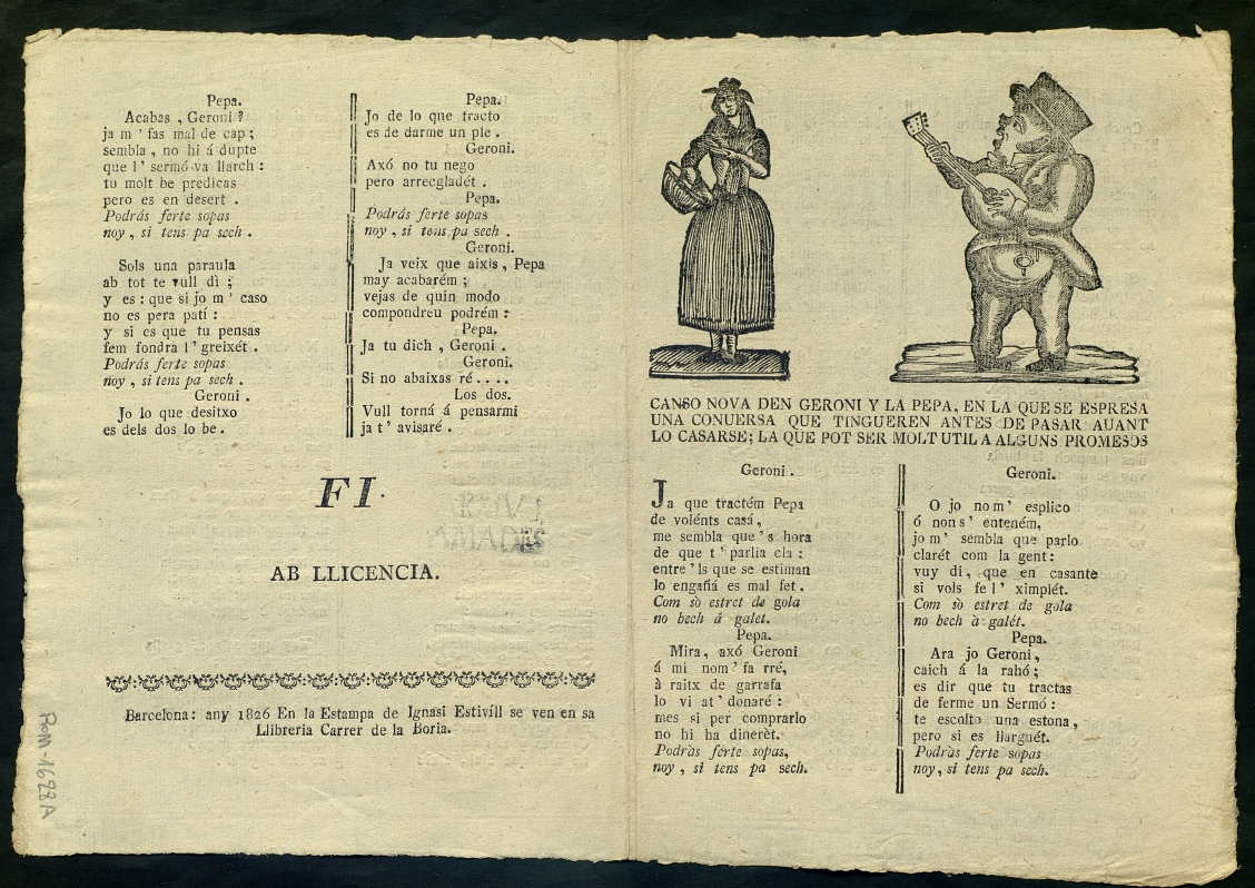 (1826) "Canso nova den Geroni y la Pepa : En la que se espresa una conversa que tingueren antes de pasar avant lo casarse; la que pot ser molt util a alguns promesos". Centre de Documentació de Cultura Popular. <http://hdl.handle.net/10687/229264>. [Consulta: ]