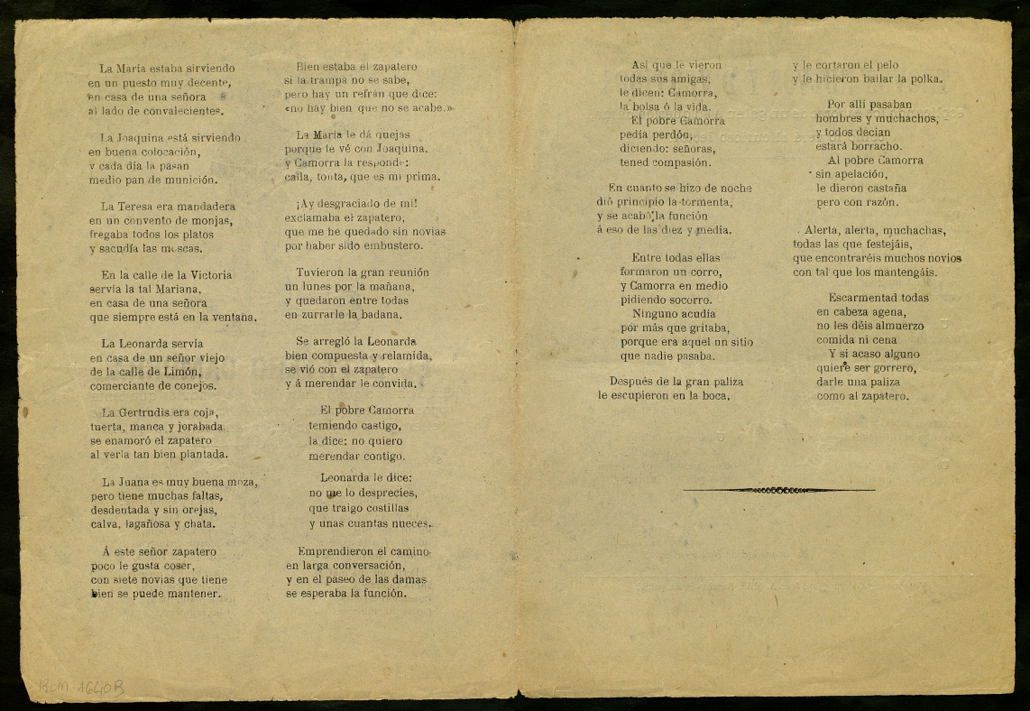 ([ent) "El zapatero camorra ... ; Trovos nuevos y divertidos : esplicando los amores de un galán á su querida dama, como lo verá el curioso lector". Centre de Documentació de Cultura Popular. <http://hdl.handle.net/10687/229275>. [Consulta: ]