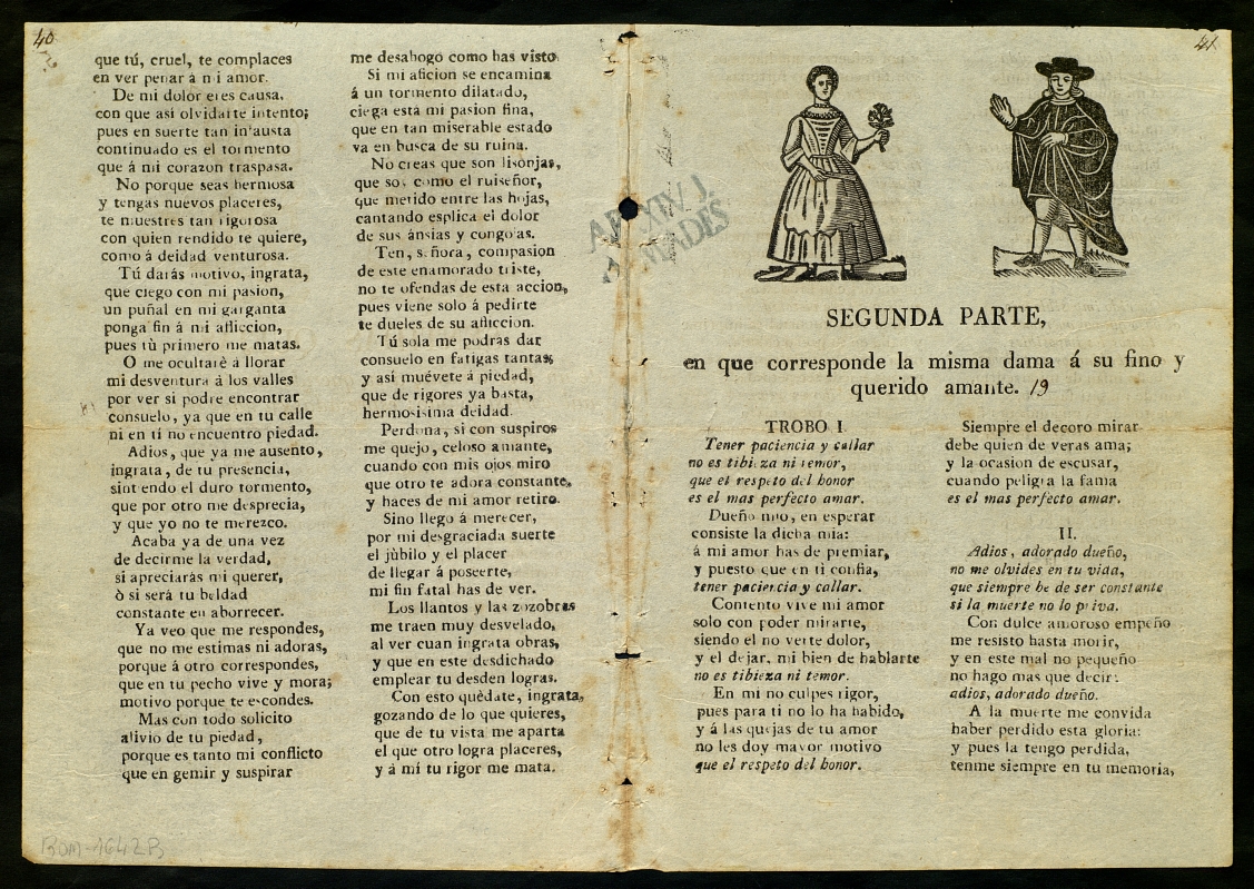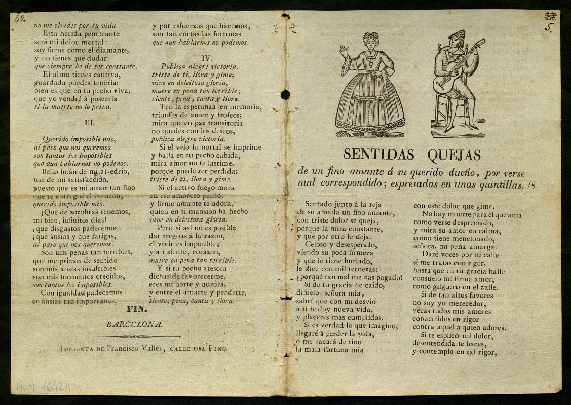 Perez de Abulagon, Juan. ([184) "Sentidas quejas de un fino amante á su querido dueño, por verse mal correspondido : espresadas en unas quintillas ; Segunda parte : En que corresponde la misma dama á su fino y querido amante". Centre de Documentació de Cultura Popular. <http://hdl.handle.net/10687/229277>. [Consulta: ]