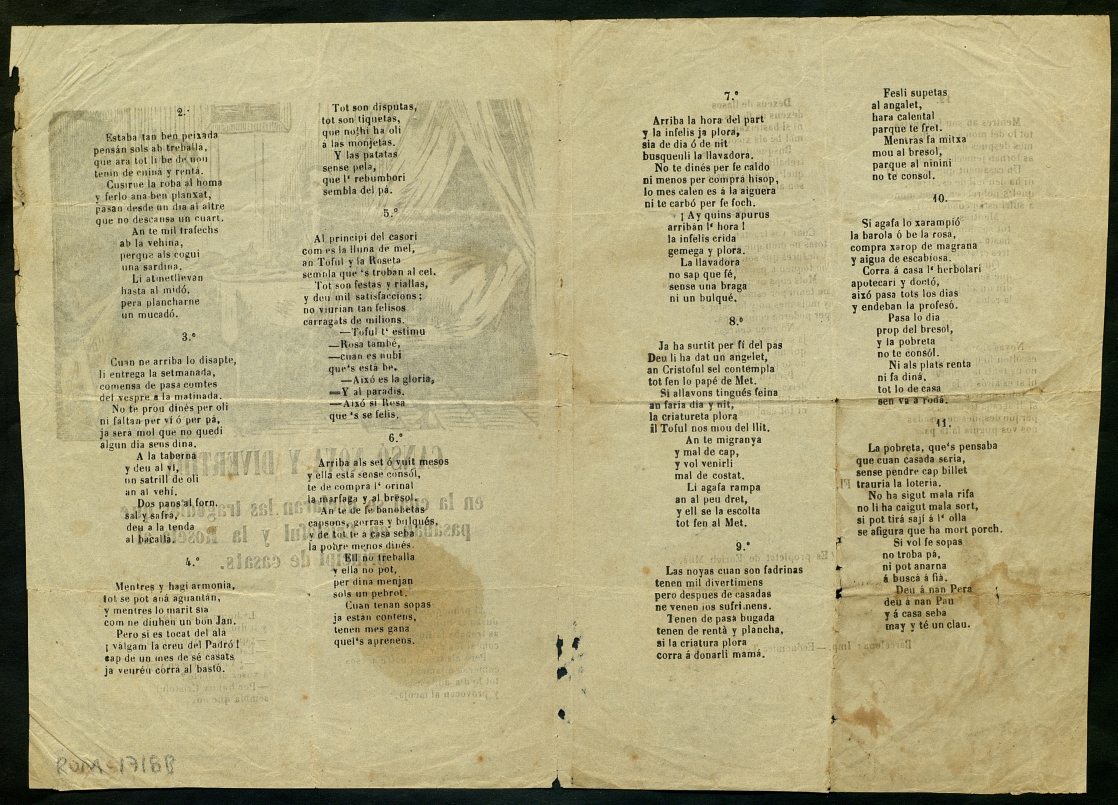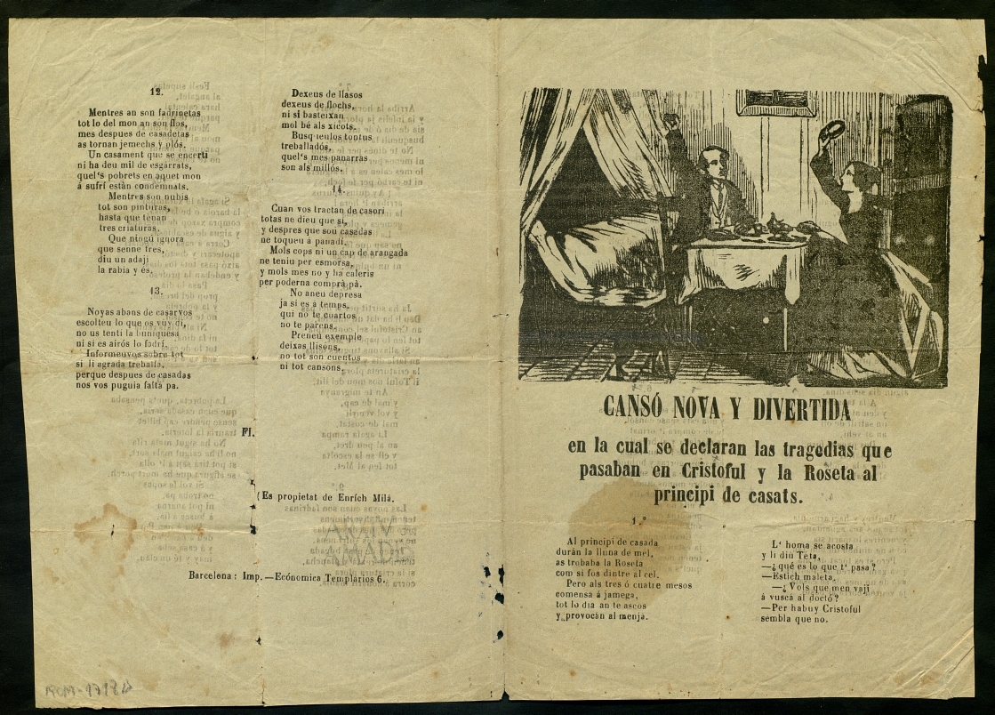 ([187) "Cansó nova y divertida : en la cual se declaran las tragedias que pasaban en Cristoful y la Roseta al principi de casats". Centre de Documentació de Cultura Popular. <