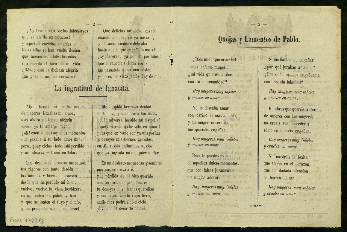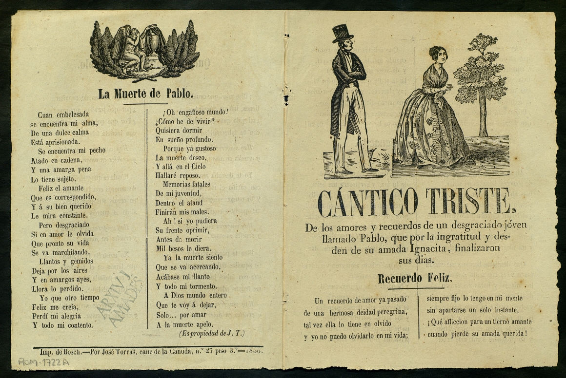 (1856) "Cántico triste ; Recuerdo Feliz ; La ingratitud de Ignacita ; Quejas y Lamentos de Pablo ; La Muerte de Pablo". Centre de Documentació de Cultura Popular. <http://hdl.handle.net/10687/229356>. [Consulta: ]