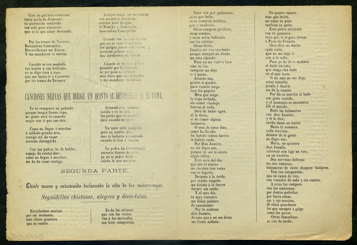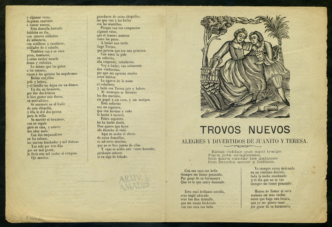 ([18-) "Trovos nuevos alegres y divertidos de Juanito y Teresa ; Canciones nuevas que dirige un quinto al despedirse de su dama ; Chiste nuevo y entretenido declarando la vida de las maturrangas : Seguidillas chistosas, alegres y divertidas". Centre de Documentació de Cultura Popular. <http://hdl.handle.net/10687/229376>. [Consulta: ]