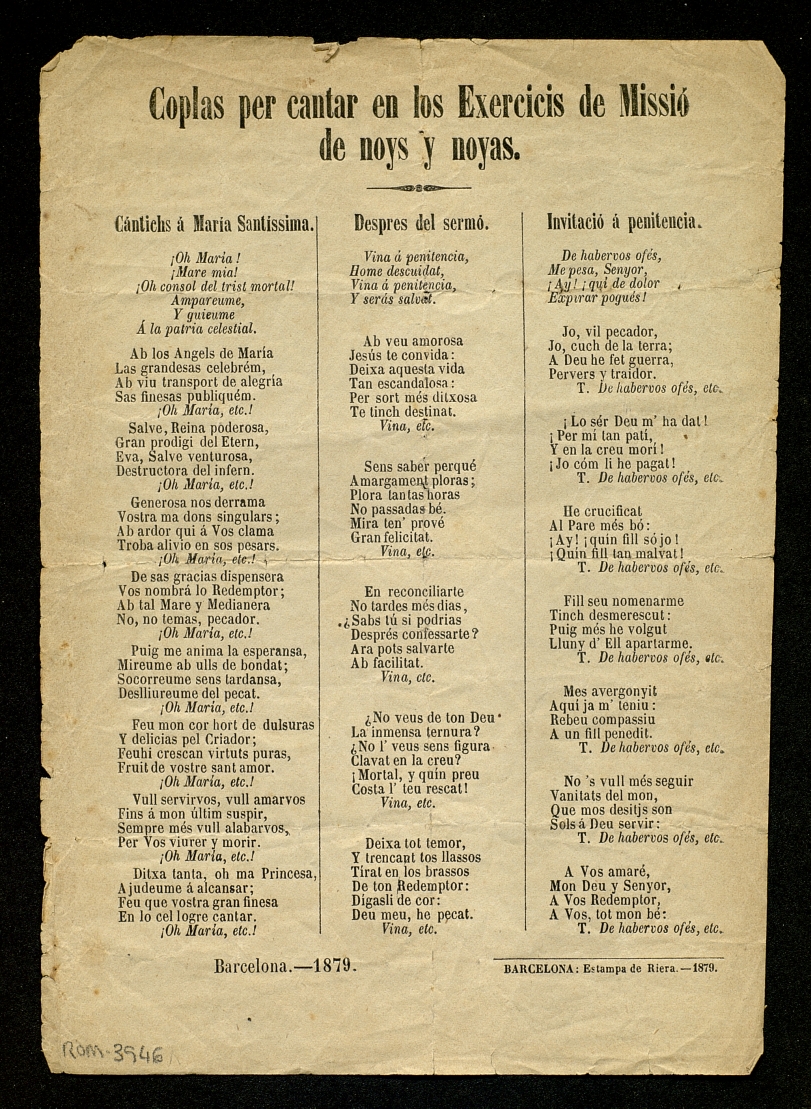 (1879) "Coplas per cantar en los Exercicis de Missió de noys y noyas ; Cántichs á Maria santissima ; Despres del sermó ; Invitació á penitencia". Centre de Documentació de Cultura Popular. <http://hdl.handle.net/10687/258580>. [Consulta: ]