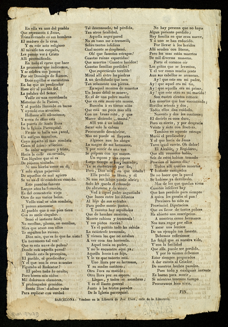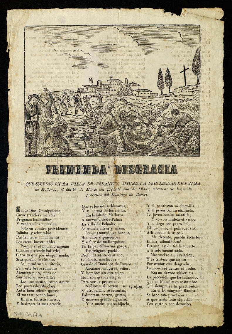 "Tremenda desgracia que sucedió en la villa de Felanitx, situada a seis leguas de Palma de Mallorca, el dia 31 de Marzo del presente año de 1844, mientras se hacia la procesion del Domingo de Ramos".