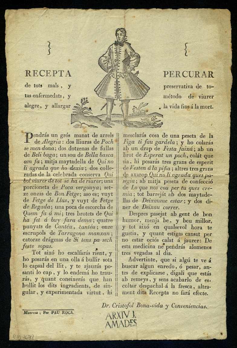 Bona-vida y Conveniencias, Cristofol. ([18-) "Recepta per curar de tots els mals, y preservativa de totes enfermetats, y método de viurer alegre, y allargar la vida fins á la mort". Centre de Documentació de Cultura Popular. <http://hdl.handle.net/10687/258669>. [Consulta: ]