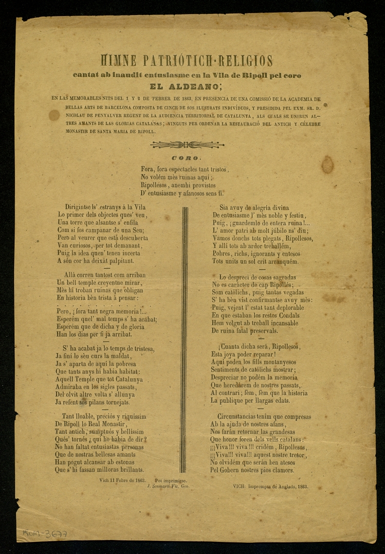"En las memorables nits del 1 y 2 de febrer de 1863, en presencia de una comissió de la Academia de Bellas Arts de Barcelona composta de cinch de sos ilustrats indivíduos, y presidida pel exm. Sr. D. Niucolau de Penyalver regent de la Audiencia Territorial de Catalunya, als cuals se uniren altres amants de las Glorias catalanas ...".