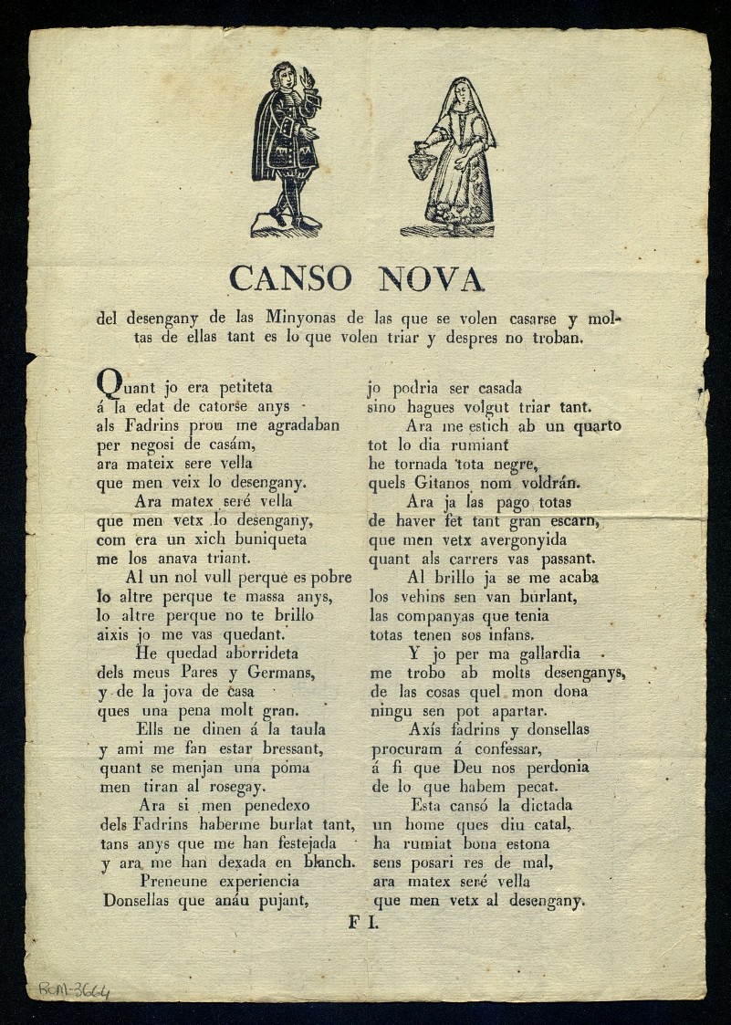 ([18-) "Canso nova del desengany de las Minyonas de las que se volen casarse y moltas de ellas tant es lo que volen triar y despres no troban". Centre de Documentació de Cultura Popular. <http://hdl.handle.net/10687/258689>. [Consulta: ]