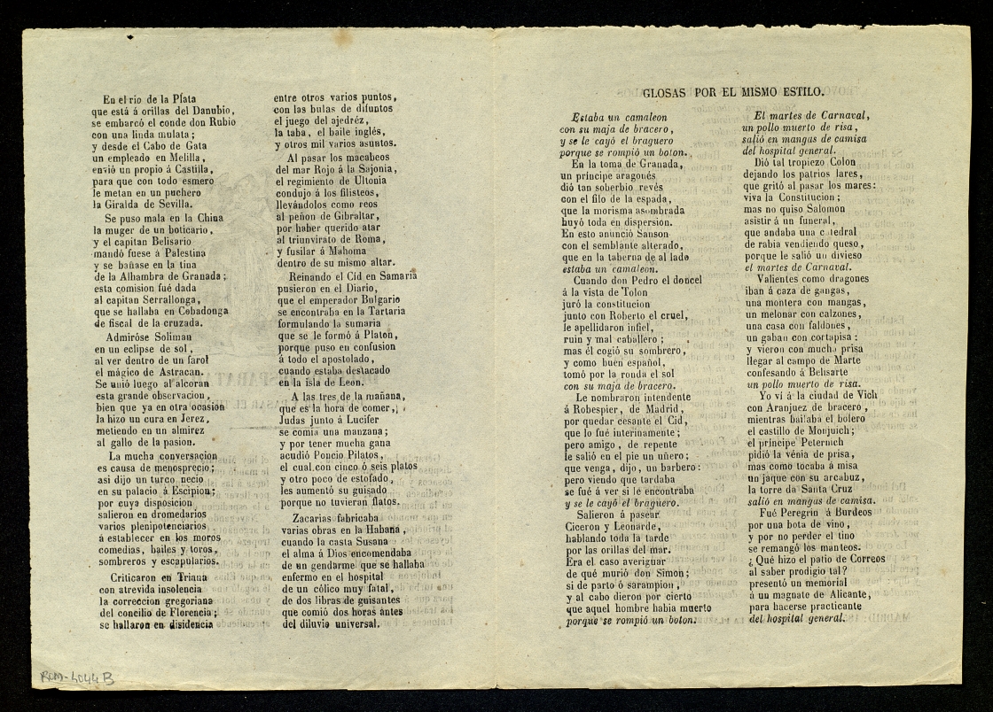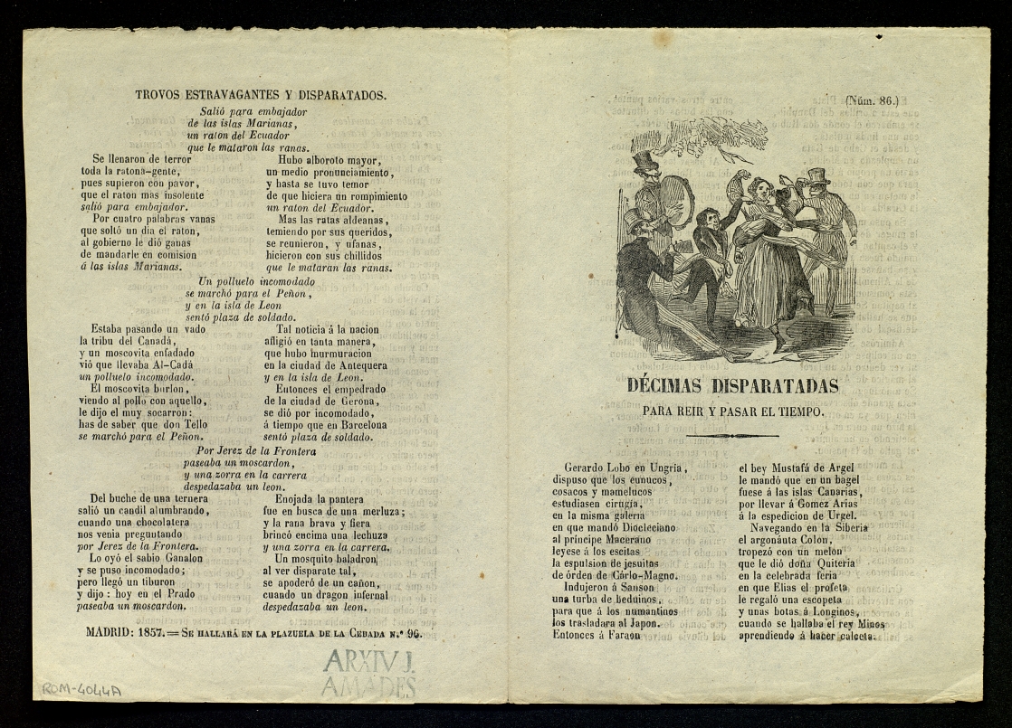 (1857) "Décimas disparatadas para reir y pasar el tiempo ; Glosas por el mismo estilo ; Trovos estravagantes y disparatados". Centre de Documentació de Cultura Popular. <http://hdl.handle.net/10687/258706>. [Consulta: ]