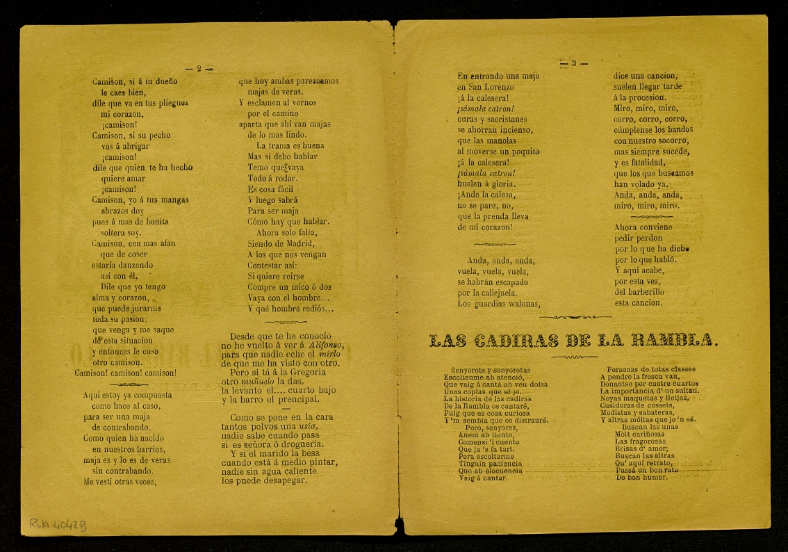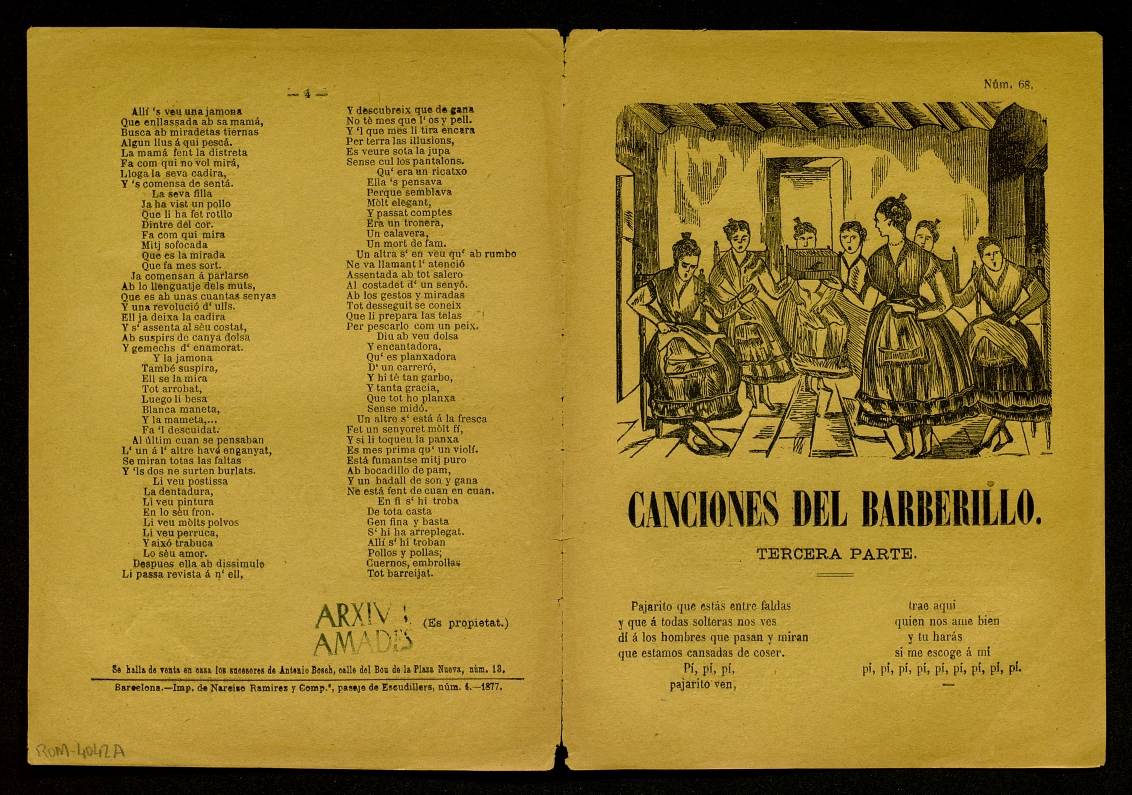 (1877) "Canciones del barberillo : tercera parte ; Las cadiras de la rambla". Centre de Documentació de Cultura Popular. <http://hdl.handle.net/10687/258728>. [Consulta: ]