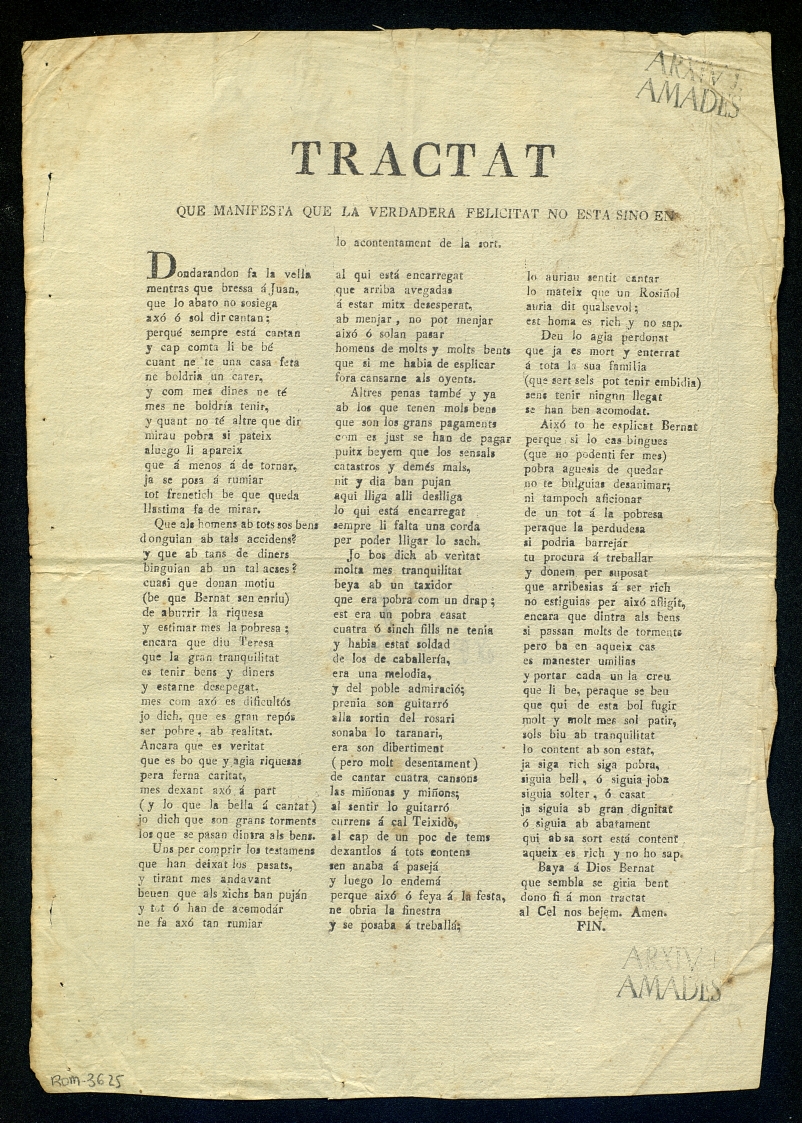 ([18-) "Tractat que manifesta que la verdadera felicitat no esta sino en lo acontentament de la sort". Centre de Documentació de Cultura Popular. <