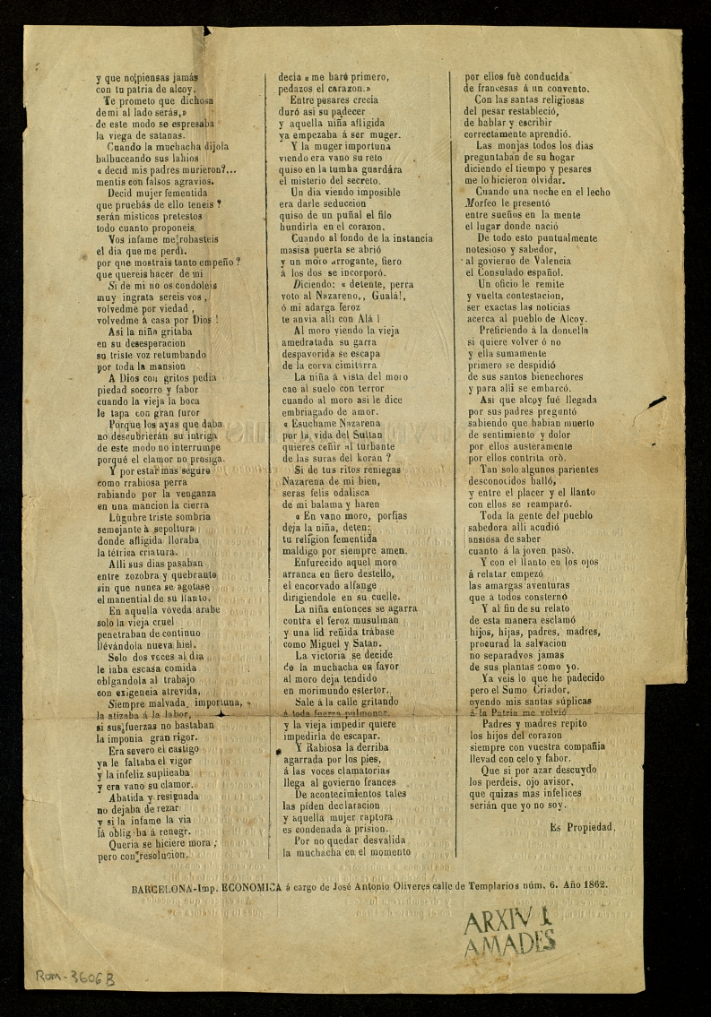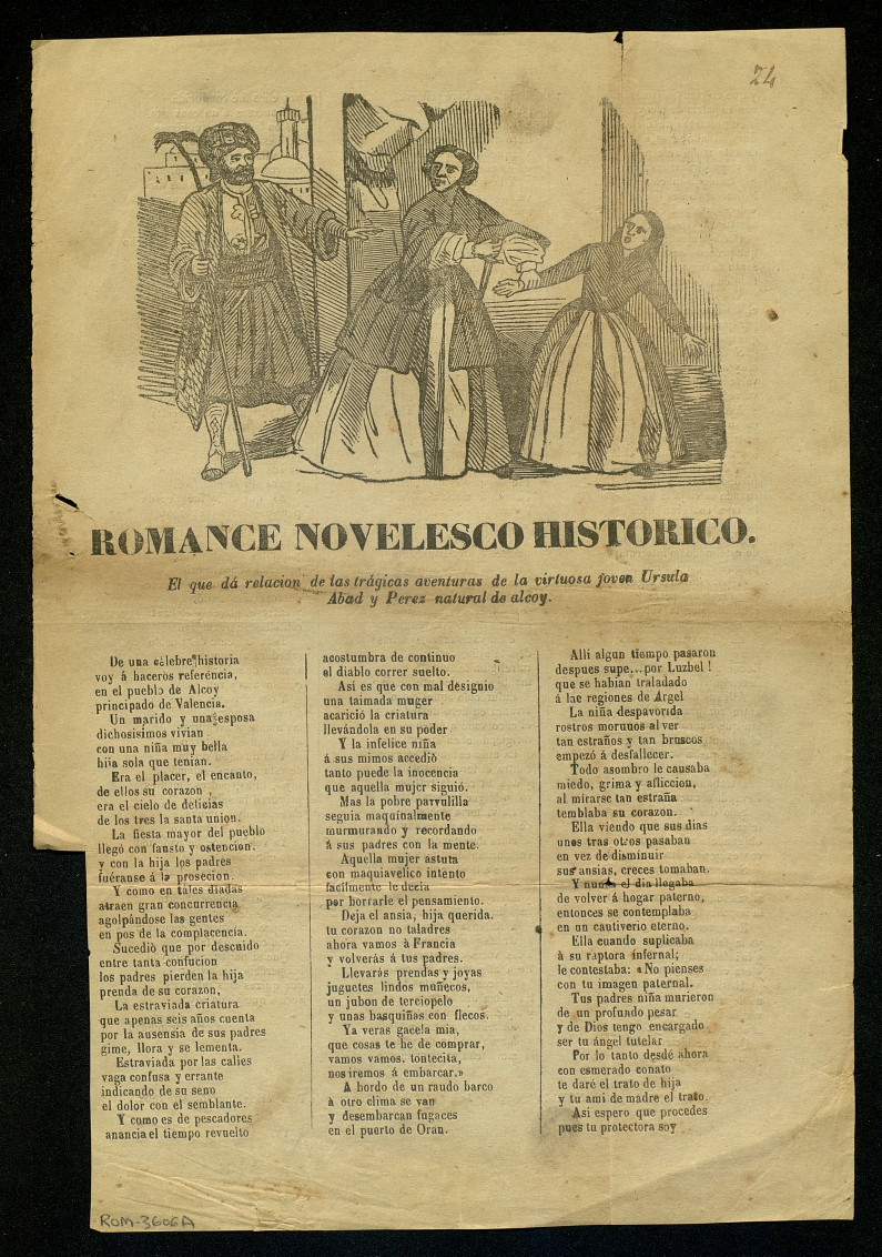 (1862) "Romance novelesco historico : el que dá relacion de las trágicas aventuras de la virtuosa joven Ursula Abad y Perez natural de Alcoy". Centre de Documentació de Cultura Popular. <http://hdl.handle.net/10687/258759>. [Consulta: ]