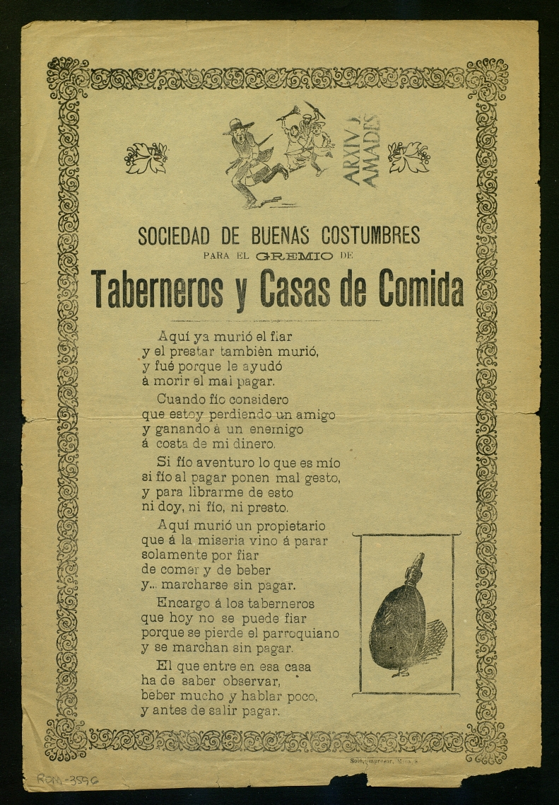 ([18-) "Sociedad de buenas costumbres para el gremio de Taberneros y Casas de Comida". Centre de Documentació de Cultura Popular. <http://hdl.handle.net/10687/258771>. [Consulta: ]