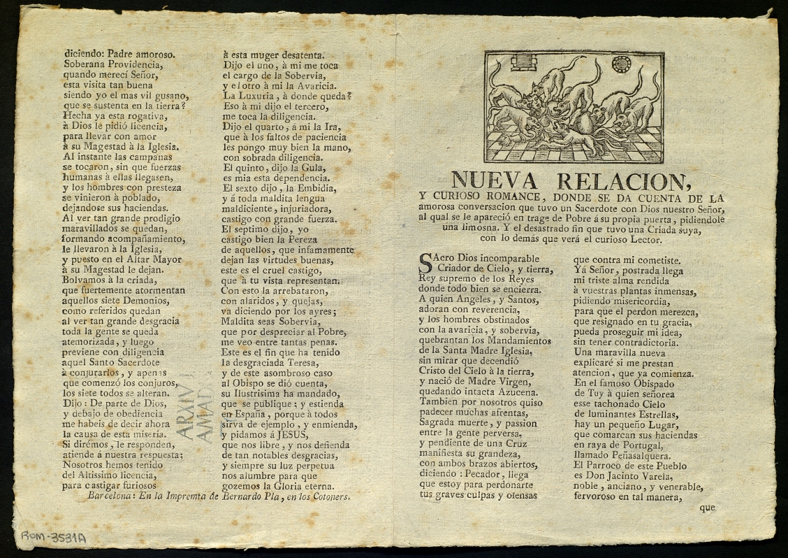 ([18-) "Nueva relacion, y curioso romance, donde se da cuenta de la amorosa conversacion que tuvo un sacerdote con Dios nuestro Señor …". Centre de Documentació de Cultura Popular. <http://hdl.handle.net/10687/258809>. [Consulta: ]