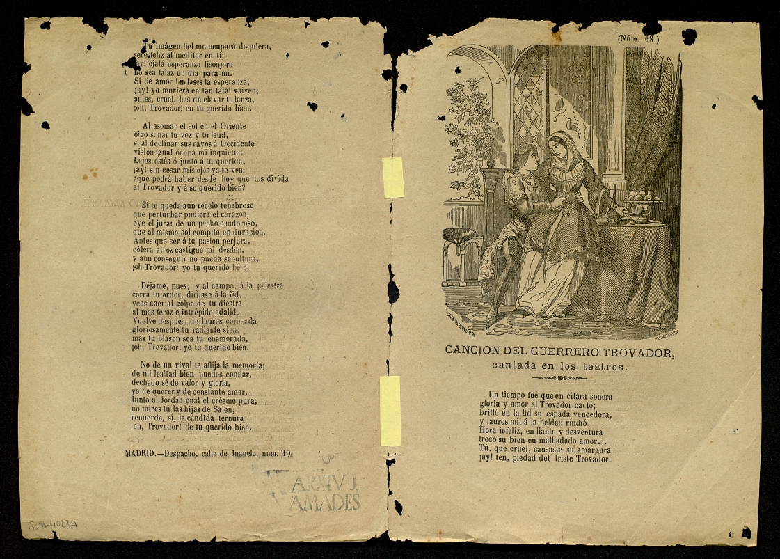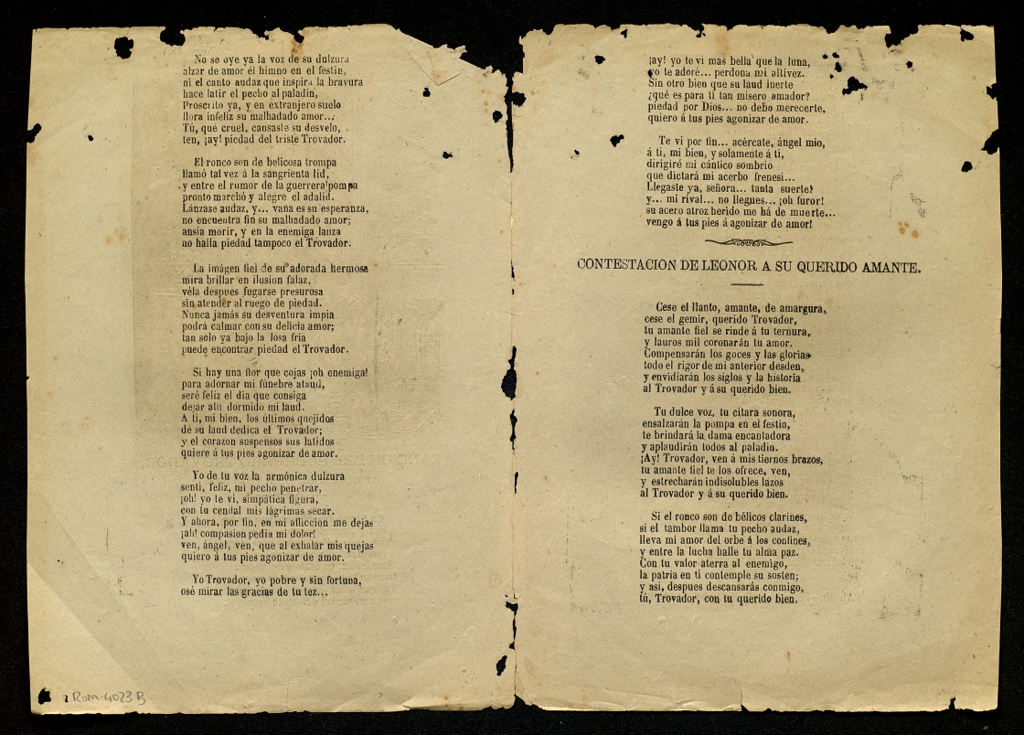([18-) "Cancion del guerrero trovador, cantada en los teatros ; Contestacion de Leonor a su querido amante". Centre de Documentació de Cultura Popular. <http://hdl.handle.net/10687/258813>. [Consulta: ]