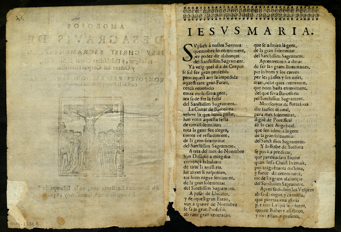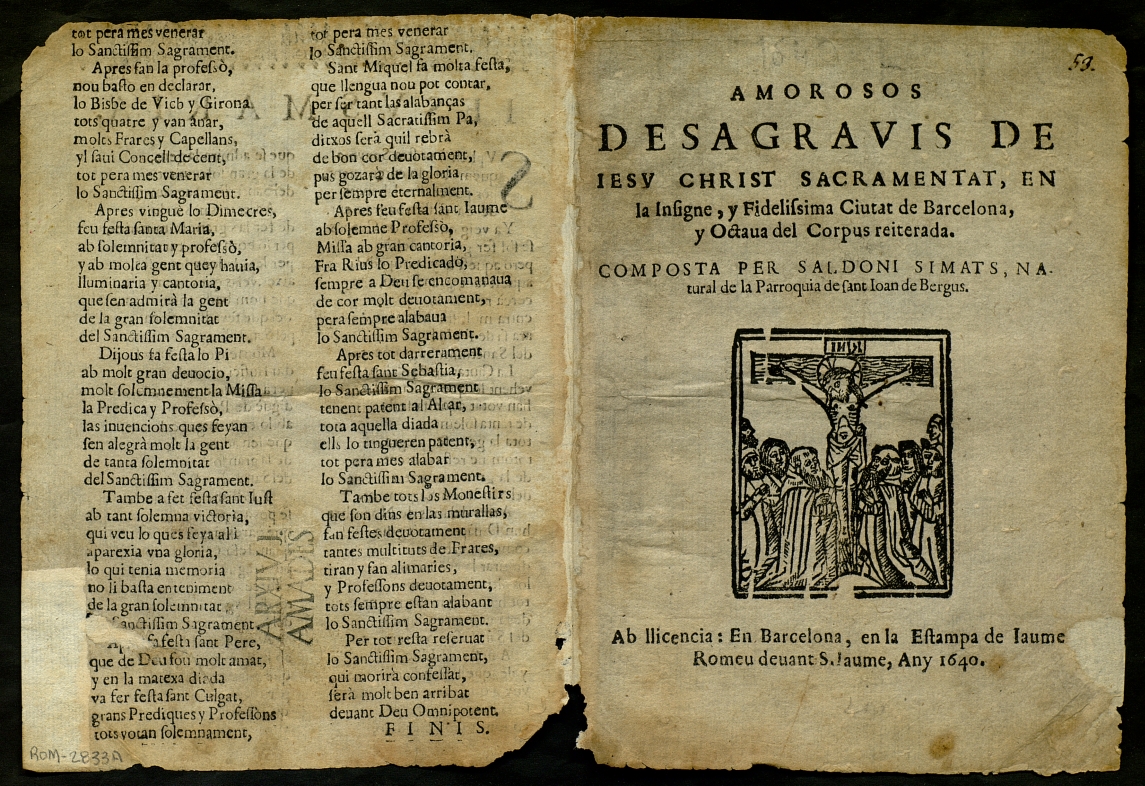 (1640) "Amorosos desagravis de Iesu Christ sacramentat, en la Insigne, o Fidelissima Ciutat de Barcelona, y Octaua del Corpus reiterada". Centre de Documentació de Cultura Popular. <http://hdl.handle.net/10687/292452>. [Consulta: ]