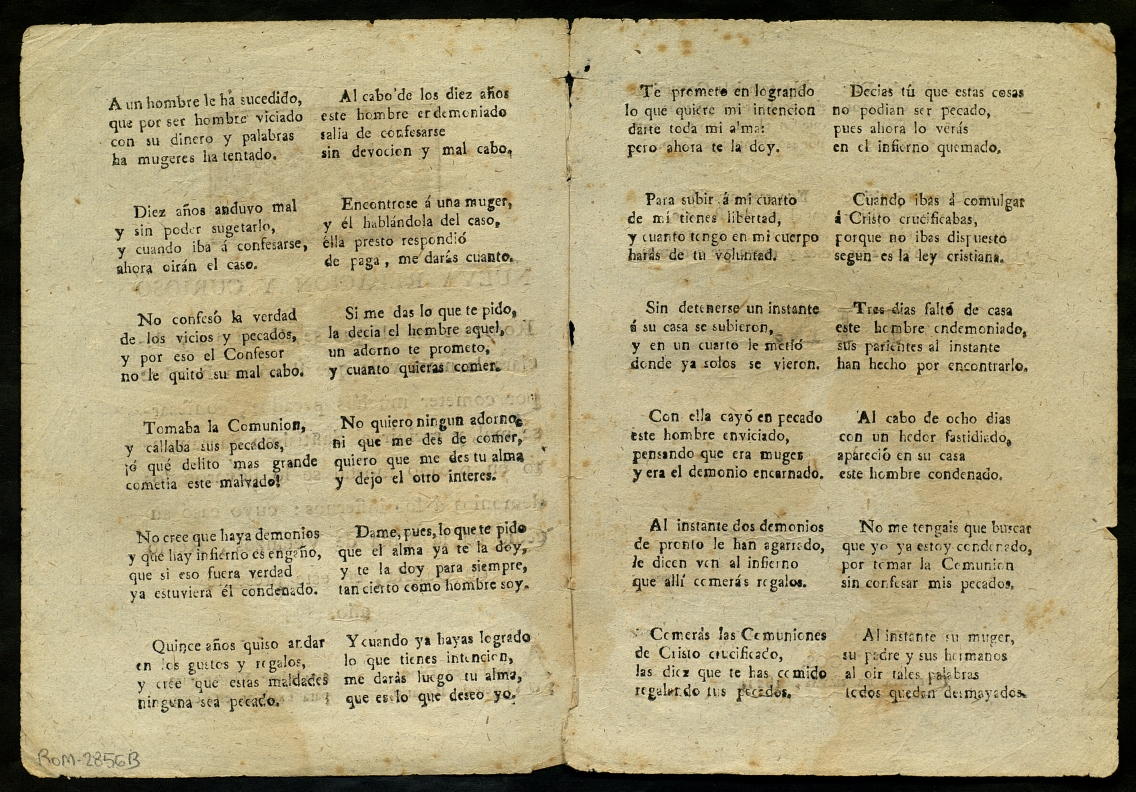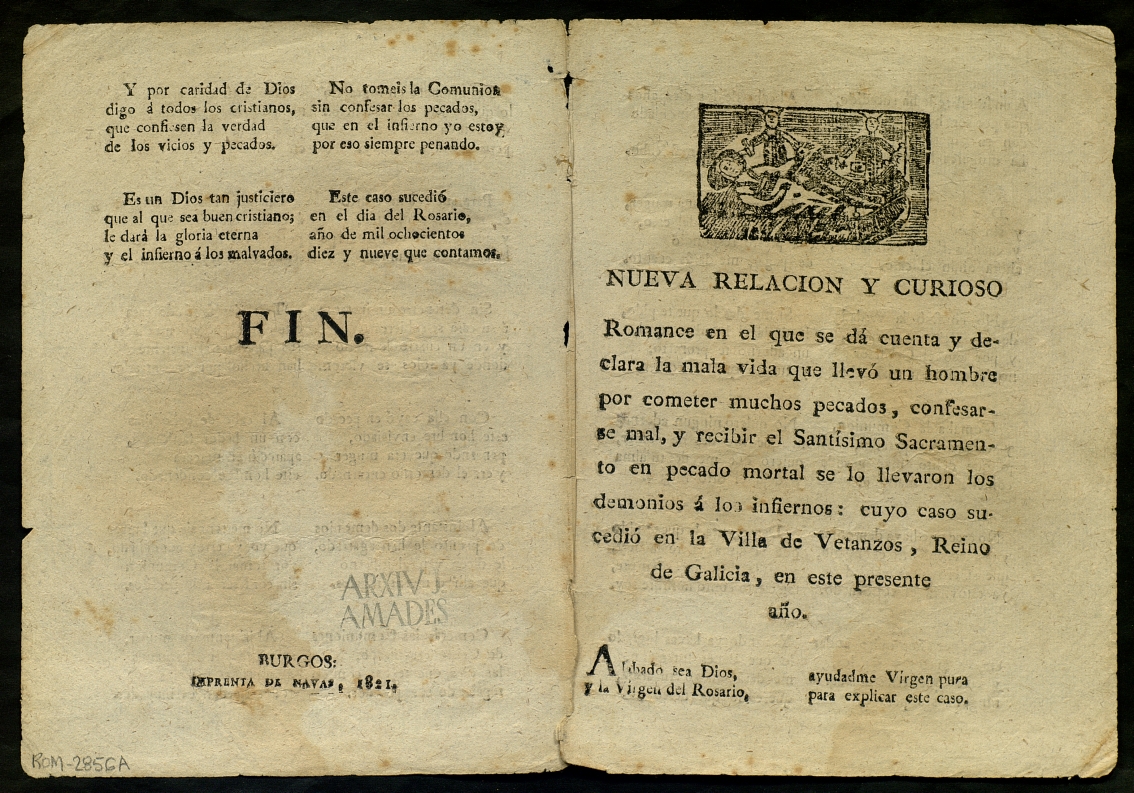 "…en el que se dá cuenta y declara la mala vida que llevó un hombre por cometer muchos pecados, confesarse mal, y recibir el Santísimo Sacramento en pecado mortal se lo llevaron los demonios á los infiernos: cuyo caso sucedió en la Villa de Vetanzos, Reino de Galicia, en este presente año"